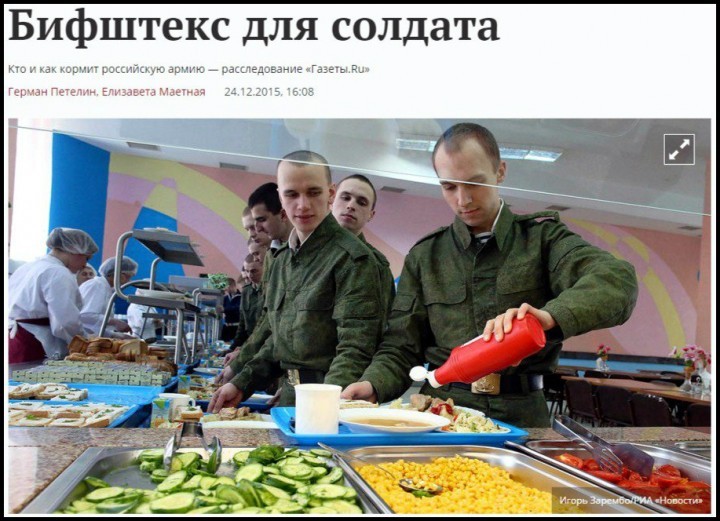 «Порции сала-шпик, которую получали военнослужащие, составляла 15,2 г, а не 20 г,» «На ужин солдатам вместо жареной горбуши давали более дешевую камбалу» Суть проблемы наши либералы видят в том, что в 2010 году питание армии перевели на аутсорсинговую систему. Суть работы: Минобороны учредило компанию «Военторг», которая уже работает с двумя десятками компаний, осуществляющих организацию питания. В результате: Минобороны занимается своими делами - укрепляет оборону страны, солдаты своими – служат и учатся быть хорошими солдатами, а бизнес имеет возможность заработать. Все счастливы? Ан нет. Либералы прям мечутся, не зная, с какой стороны укусить. То им не нравилось, что солдаты вместо стрельбы по мишеням чистят картошку. То им не нравится, что у нас государство вмешивается в работу рынка и не дает бизнесменам продыху. Теперь вроде и солдаты картошку не чистят, и бизнес имеет возможность зарабатывать, но нет, все равно не нравится. А вся суть – это 50 исков за все время работы системы. 50 исков на проблемы с питанием миллионной армии, раскинутой по территории самой большой страны мира. Общая сумма исков 4,8 млн. рублей, это по 96 тыс. на иск в среднем, что говорит о несерьезности ущерба. И из этого раздувается проблема. А теперь, внимание, из 50 исков к фирмам, кормящих наших солдат, были удовлетворены только 7! Остальные либо развалились в процессе, не дойдя до суда, либо оказались несостоятельными. И в связи с этим мне стало вот что интересно, авторы статьи в курсе, что энергетическая ценность дневного рациона российского солдата самая высокая в мире и составляет 4300 килокалорий в сутки?