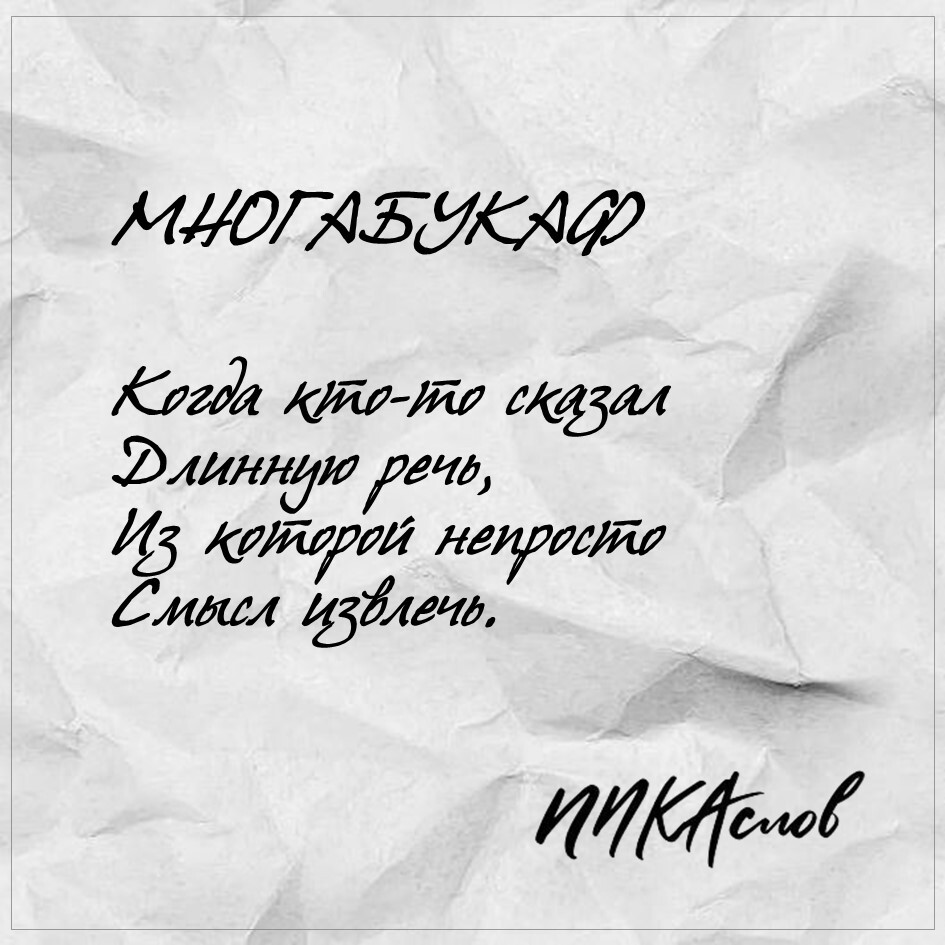 2 DELETED ПИКАслов МНОГАБУКАФ 5 месяцев назад Многабукаф (сленг, от "много букв") - когда используется гораздо больше слов, чем обычно принято для выражения смысла. [моё] Сленг Общение Стихи Современная поэзия Поэзия Словарь Рифма Ещё 0
