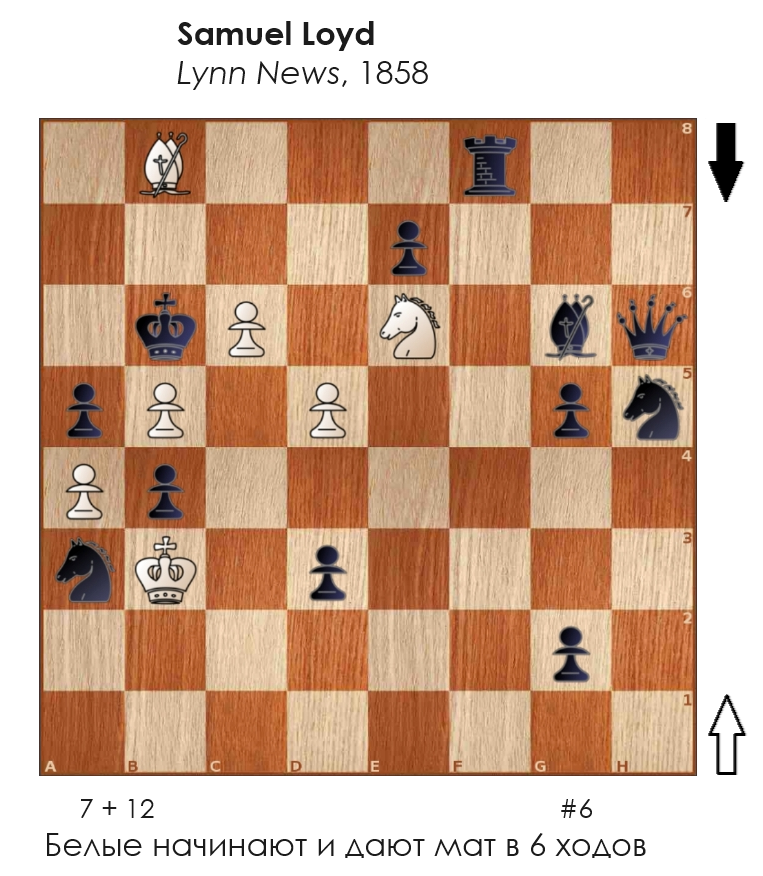 По настойчивой просьбе @truspqr - #comment_311299333 решаем шестиходовочку от американского составителя различных задач и головоломок, в том числе и шахматных, Сэмюэля Лойда (Samuel Loyd, 1841 - 1911) из американской газеты "Lynn News" за 1858 год.