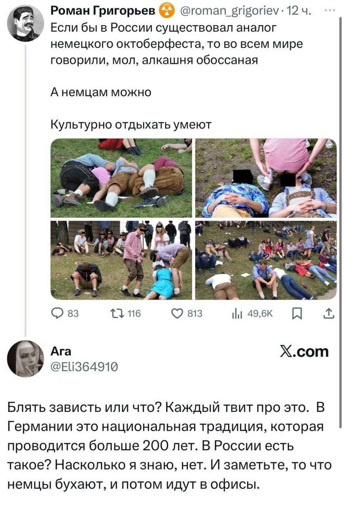 Настоящий ариец должен уметь культурно отдыхать: сначала за 200 евро нажраться пива из литровых кружек, затем аккуратно изрыгать его на себя, а потом медитативно заснуть в собственных экскрементах и моче под одобрительные взгляды туристов.