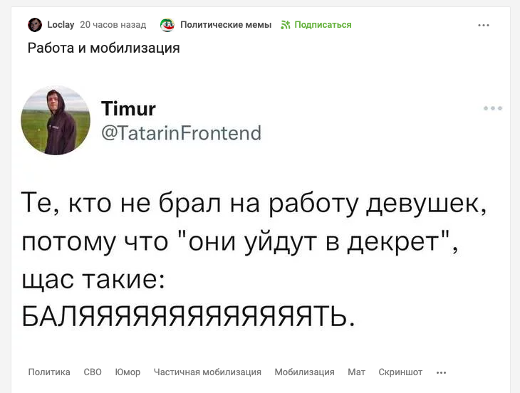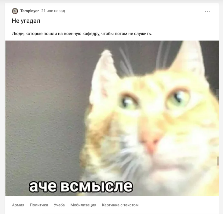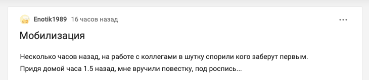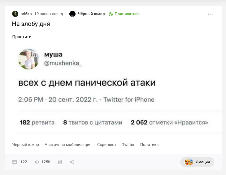 nikeditae Мобилизация, такая мобилизация... 3 года назад Я так понимаю, на Пикабу, как и в другие соц сети, можно пару дней не заходить. Ниже скрины постов ПОДРЯД из Горячего. Я такого пизд*ца в соц сетях даже во время ковида не припомню...П.С. Я хз как делать "длинные скрины". Мобилизация Частичная мобилизация Социальные сети Пост Мат Длиннопост Ещё 0