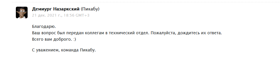Попытки переустановки приложения, чистки кэша и всего такого прочего ни к чему, понятное дело, не привели. Что остаётся? Правильно, писать в саппорт! Именно этим я и занялся ещё в прошлом году. Двадцать первого декабря я написал в поддержку; Демиург Назаркский быстро ответил мне, задал уточняющие вопросы о моём телефоне, ОС и версии мобильного приложения, после чего передал проблему в коллегам технический отдел.