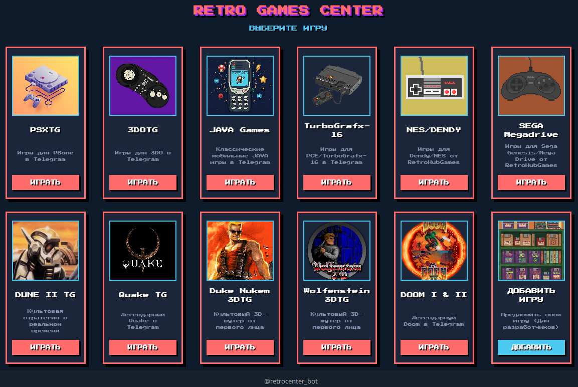 RGC - отдельное приложении-каталог, где собраны все ретроигры (боты) из TG в одном месте и там всегда будет во что поиграть с таким же моментальным запуском. Принял я это решения из за большой фрагментации своих проектов. У меня есть еще много чего в разработке на будущее, и чтобы мои игры не затерялись я решил сделать приложение из которого всё это можно запустить.