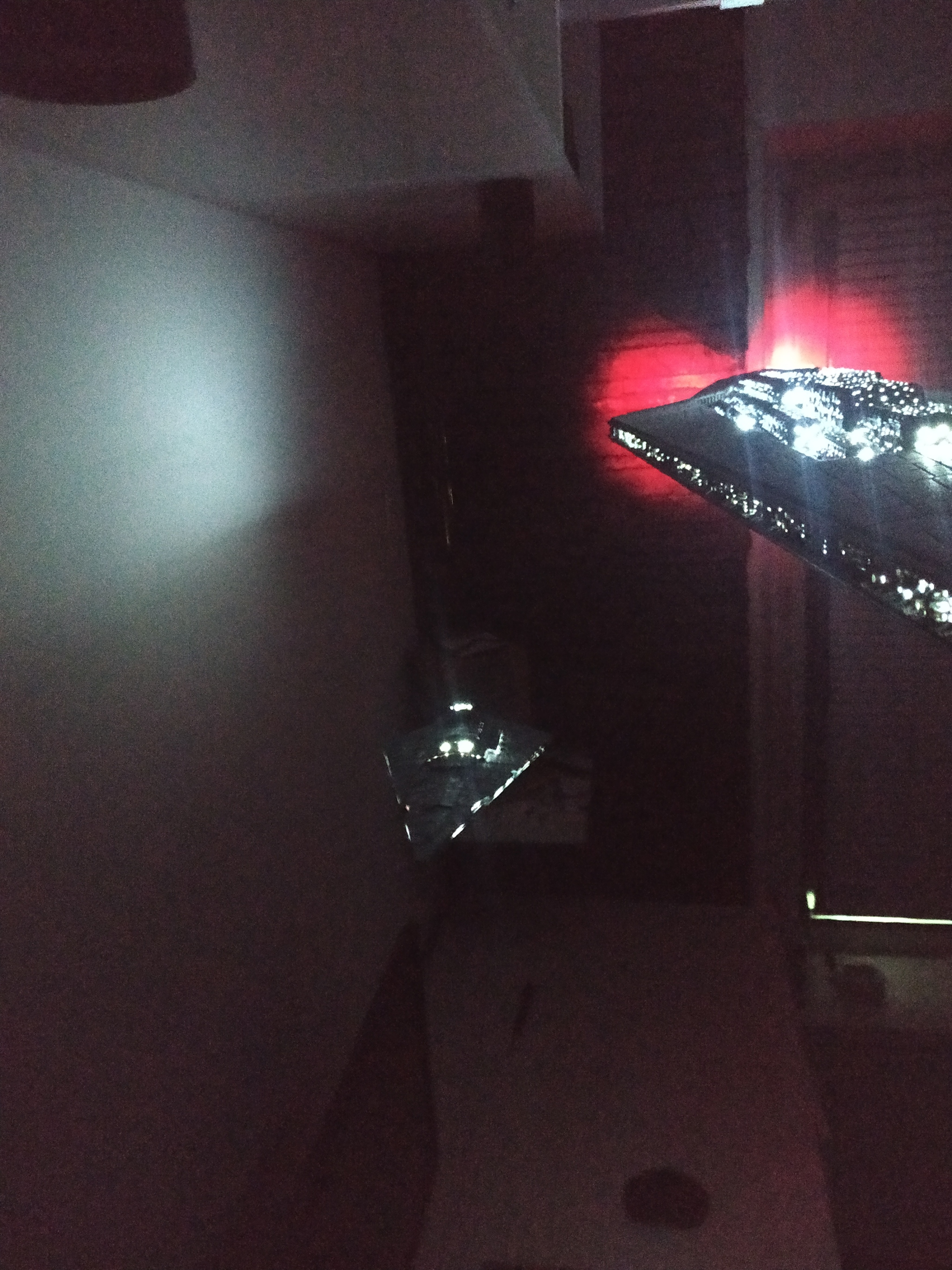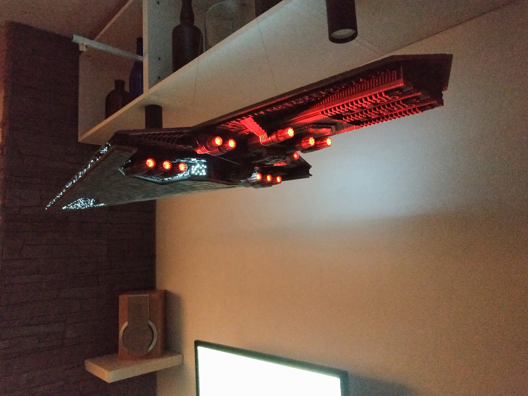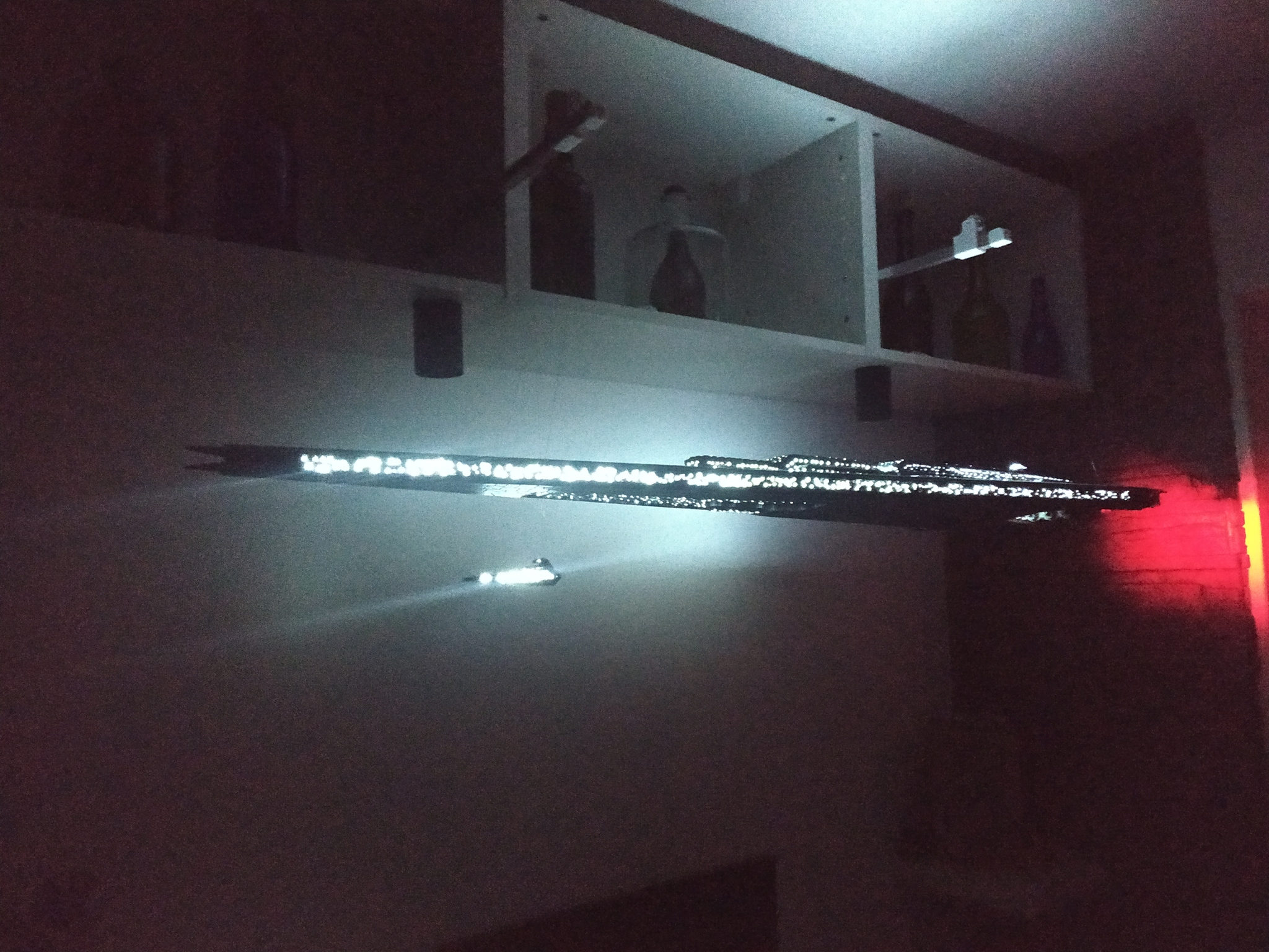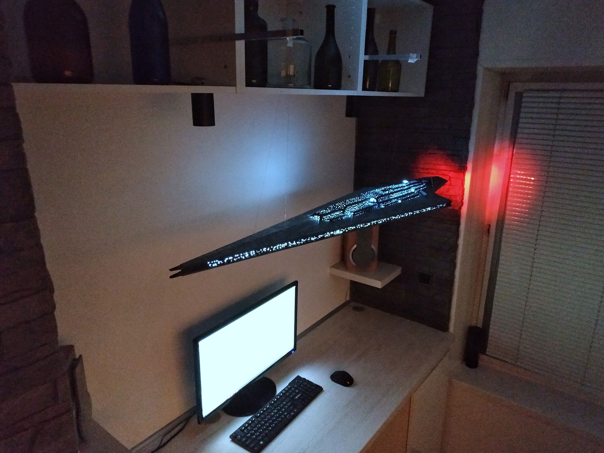Технические характеристики: 3d-печать. Масса 34г, длина 114 мм. Масштаб модели примерно 1:14194 (~14,4 метра в 1 миллиметре, аналогично его старшему по классу товарищу). Внутри размещена светодиодная подсветка, питающаяся от двух элементов питания типа AG4. Система рассеивания света оптоволоконная, использован один светодиод. Производство с начала создания 3d модели и до финальной сборки заняло порядка 1-й недели.