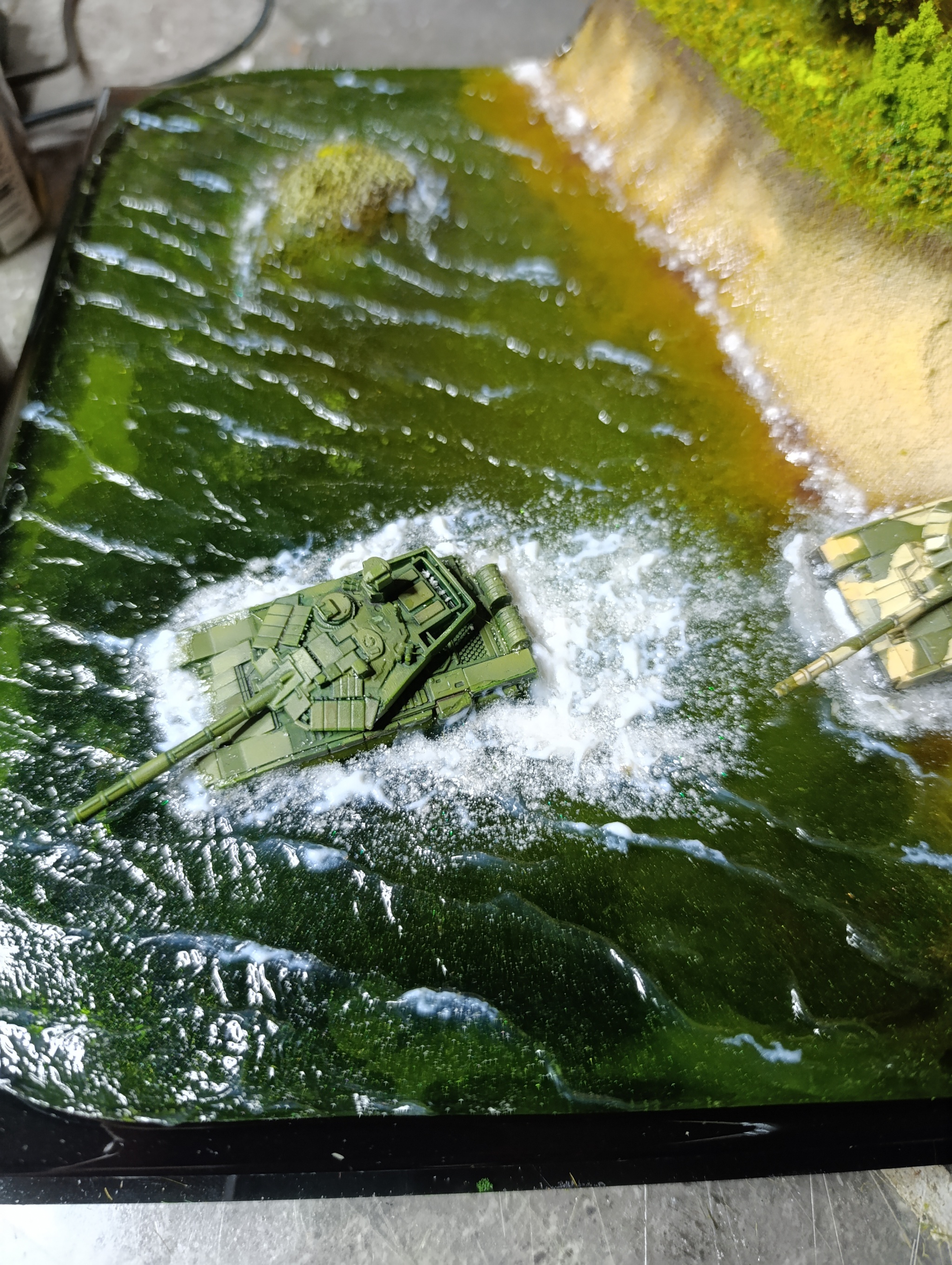 Обычно я поверхность воды гравирую но не в этот раз.Решил что масштаб и поверхность реки позволяет использовать старый рецепт .Прозрачный моделирующий гель.Пока нанес первый слой .Он пока белый но спустя несколько часов станет прозрачным , и буду наносить второй а потом местами и третий слой , тем самым наращивать волны .Полоской кистью намазываю небольшой участок реки гелем , и пока гель мягкий раздуваю его потоком воздуха из аэрографа.Лучше гель наносить участками и с ним работать .Давление воздуха должно быть небольшим .Это позволяет контролировать текстуру и не забрызгать все окружающее.
