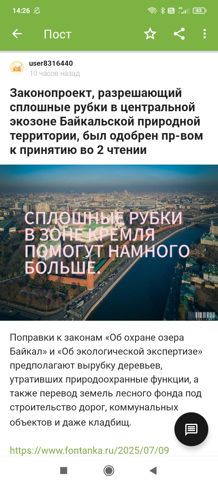 Безобидный пост про Законопроект, разрешающий сплошные рубки в центральной экозоне Байкальской природной территории, одобренный пр-вом к принятию во 2 чтении с картинкой-пояснением "Сплошные вырубки в зоне кремля помогут намного больше" вызвал у модераторов Пикабу приступ цензуры. Да, такой, что к посту прилепили комментарий модераторов "без опознавательных знаков" про кладбища, дороги и что-то там. Типа это ТС сам дописал. Поднимите пост, иначе эти поборники за бохоуходность информации начнут дописывать посты про супружеские взаимоотношения и советовать позы.