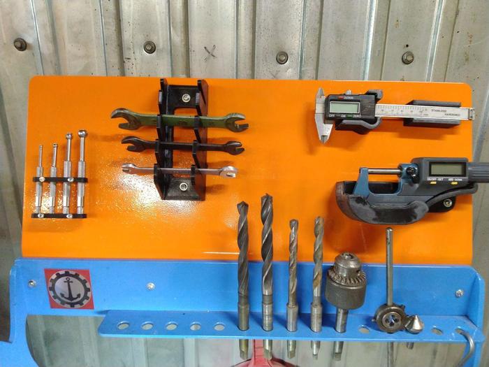 Панель инструментов. Отверстия под КМ-1 и напечатанные ложементики. Слева направо: телескопические калибры, ключи от ЗБ и резцедержки, штангенциркуль 0-120, микрометр 0-25.
