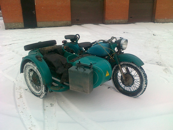 Вощем, страдал я страдал... и мои мольбы были услышаны. Отец друга нашёл у себя в гараже под слоями лежалого хлама и прелых ватников настольный токарно-винторезный станочек ТВ-16. Полностью комплектный. На тумбе. Иииии... разумеется, я неистово возбудился. Поскольку был февраль, было решено по-быстрому сварить к мотоциклу Урал М-63 1957 г.в. (картинка будет ниже) тягово-сцепное устройство, взять напрокат прицеп и, насажав полную коляску таких же отчаянных долбоёбов, простите, дорогих друзей - выдвинуться на раздачу станков. Не то, чтобы мне было не на чем привезти этого малыша... просто на колясыче это прикольно.
