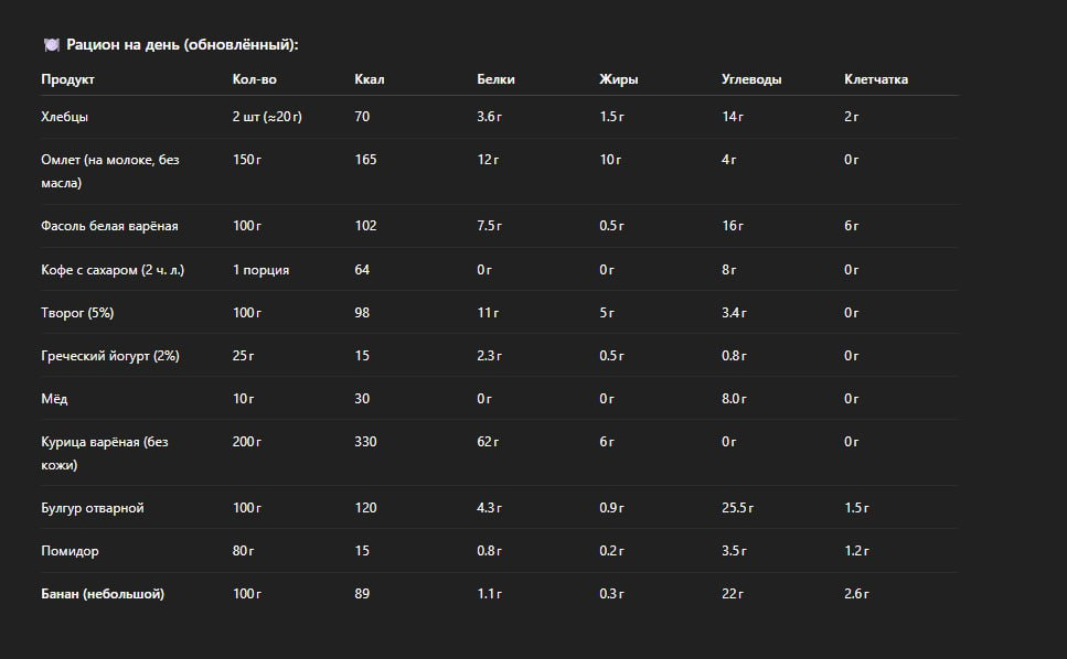 Примерный мой рацион, он так же менялся, но одно оставалось неизменным, больше белка и сложных углеводов.
