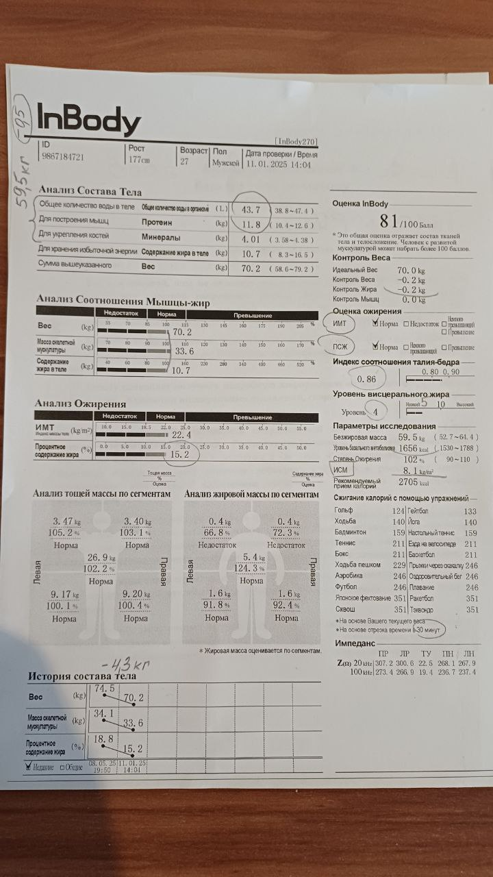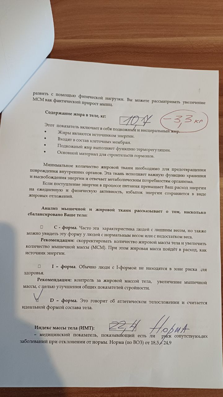 В августе я был в середке, категория I, спустя 2,5 месяца я скинул 3,3 кг, потерял 0,5 кг мышц (что нестрашно) и взял реванш у бездушной машины и попал все таки в категорию D, фитнесс-стандарт