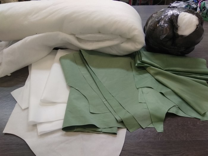Подготавливаем все материалы. Я купила плащёвку твил цвета зеленый нефрит, и нашла подкладку твил такого же цвета. Лебяжий пух, альпалюкс 100 гр и спондбан. Нитки еле еле нашла нужного цвета, и то можно было бы и потемнее их взять.