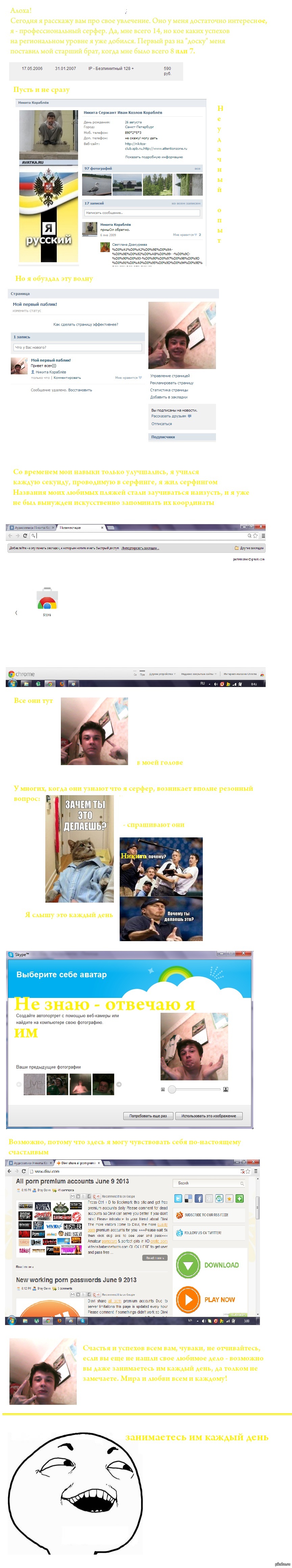 BeaverNick 12 лет назад Мое увлечение серфингом Я так посмотрел - это модно, вроде должно прокатить. А, ну и поиск не выдал похожего, авторское [моё] Длиннопост Хобби Лобби Увлечение Paint