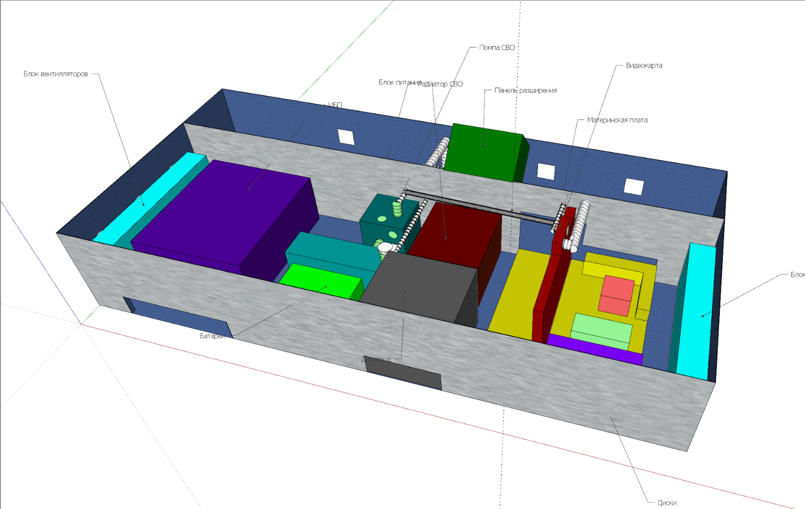 Заканчиваю работу над 3D моделью корпуса. Подвинул детали, некоторые поменял местами, продумал, как и откуда будут идти кабели, наметил где должны быть отверстия, рассчитал какие запчасти нужны для СВО, чтобы сделать монтаж шлангов красиво.
