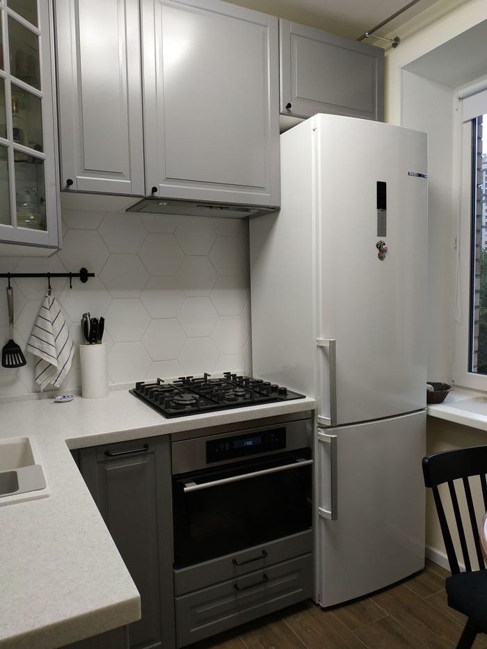 Принципиальным был холодильник на кухне, т.к. в квартире 33х метров места под него больше нет. Знаю, что стоит довольно близко к плите, но перенести газ не удалось (запросили 30 тыс), решили оставить так.