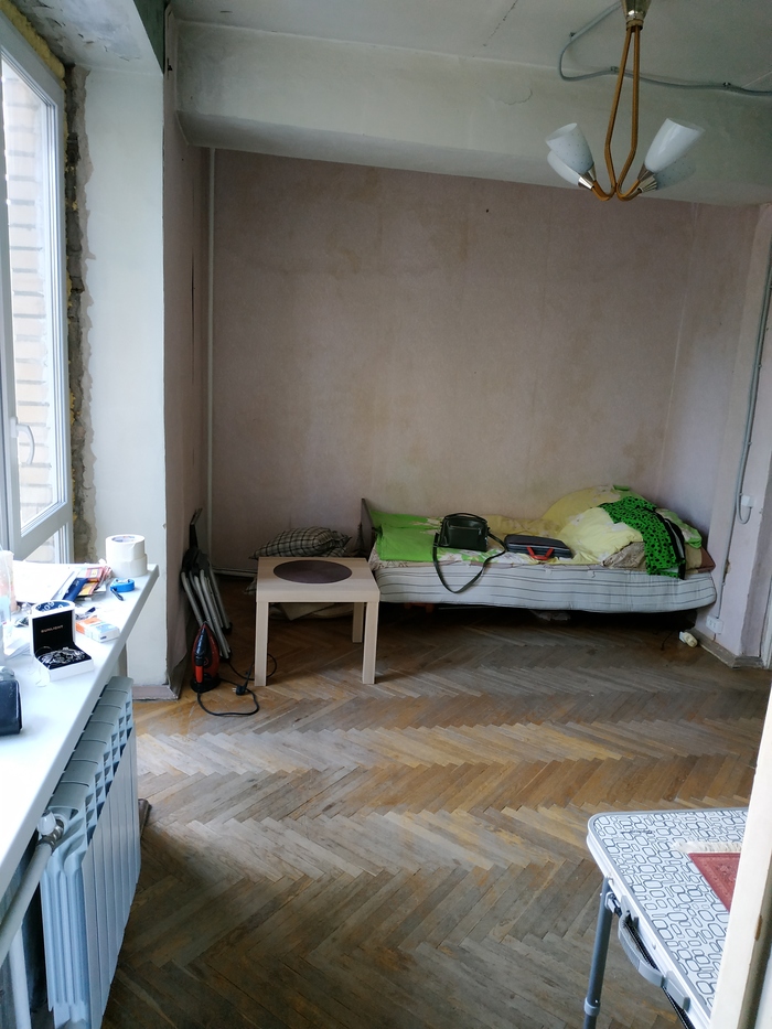 Хотела бы написать, что "сами, своими руками", но нет. Я многое по ремонту умею, но себе делать не решилась, за любой косяк грызла бы себя вечно. Поэтому был найден на профи ру прекрасный узбек Саша (реально чувак с прямыми руками и честной головой), который за месяц всё разломал (снял антресоли, штукатурку, полы, потолок) и всё заново залил, заштукатурил и поклеял. Потолки только не делал, отдельно вызывали другого ремонтника.