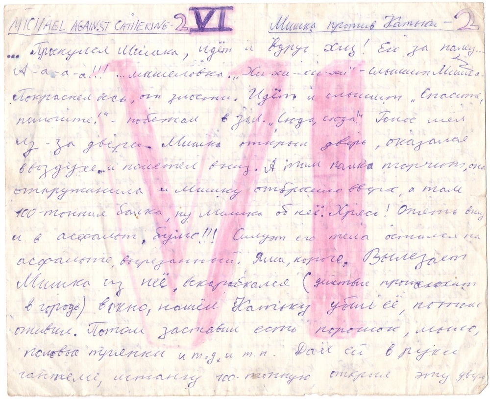 Вылезает Мишка из неё, вскарабкался (действие происходит в городе) в окно, нашёл Катьку убил её, потом оживил. Потом заставил есть порошок, мыло, половые тряпки и т.д. и т.п. Дал ей в руки гантели, штангу 100-тонную, открыл эту дверь, через которую он улетел вниз и отпустить погулять. И посмотрел вниз. О! Волосы дыбом встали. Катьке пофигу, она на парашюте спускается вниз. Катьки нет. А она убегает на стройку. Мишка за ней. Прибежал, Катьки нет. Нашёл бульдозер, залез в него. Завёл, поехал. Едет и видит, Катька ему язык показывает, он на неё двинулся. Хр-хр-хр-хр! ХРЯСЬ! Скрежет, грохот.
