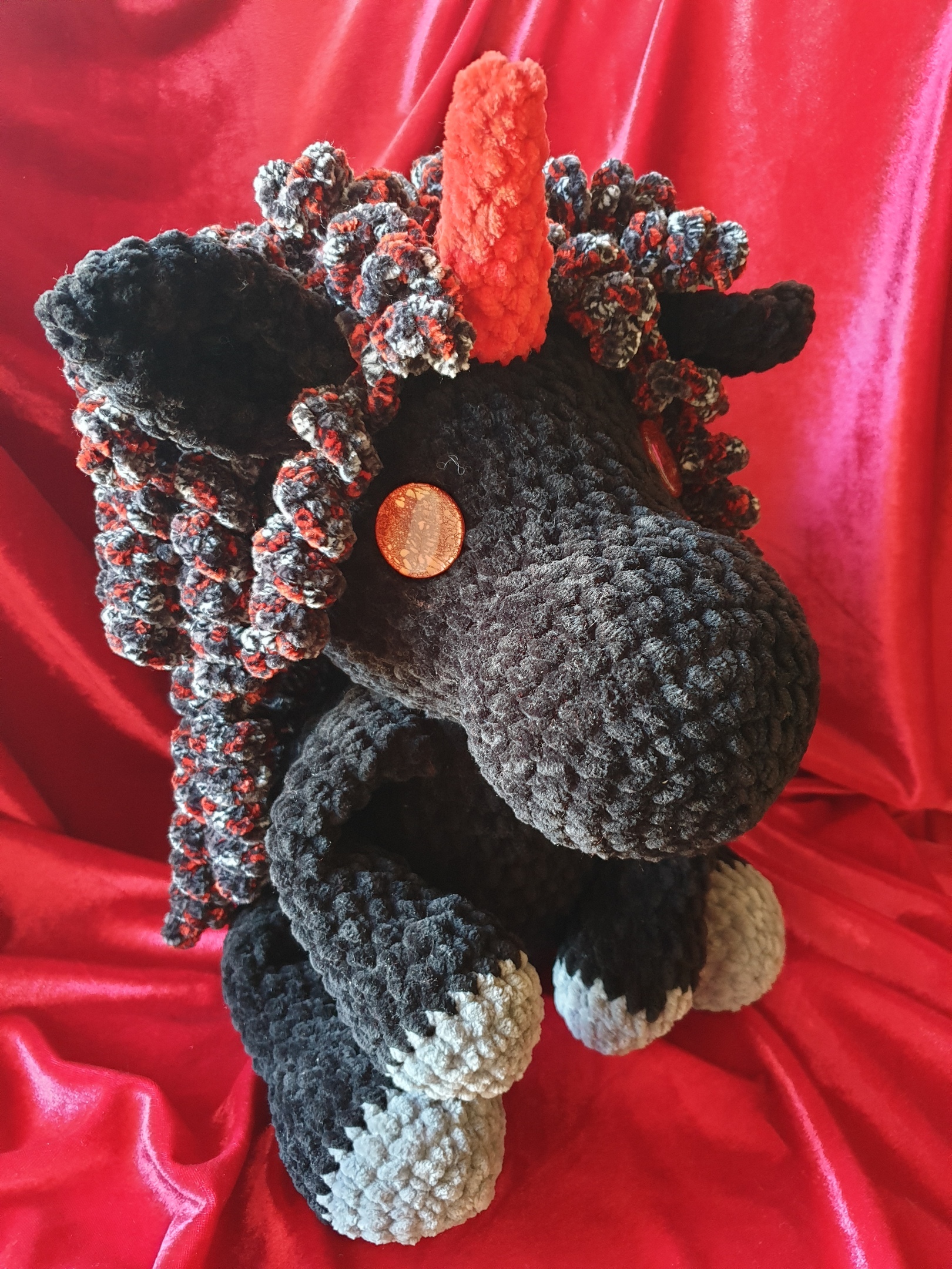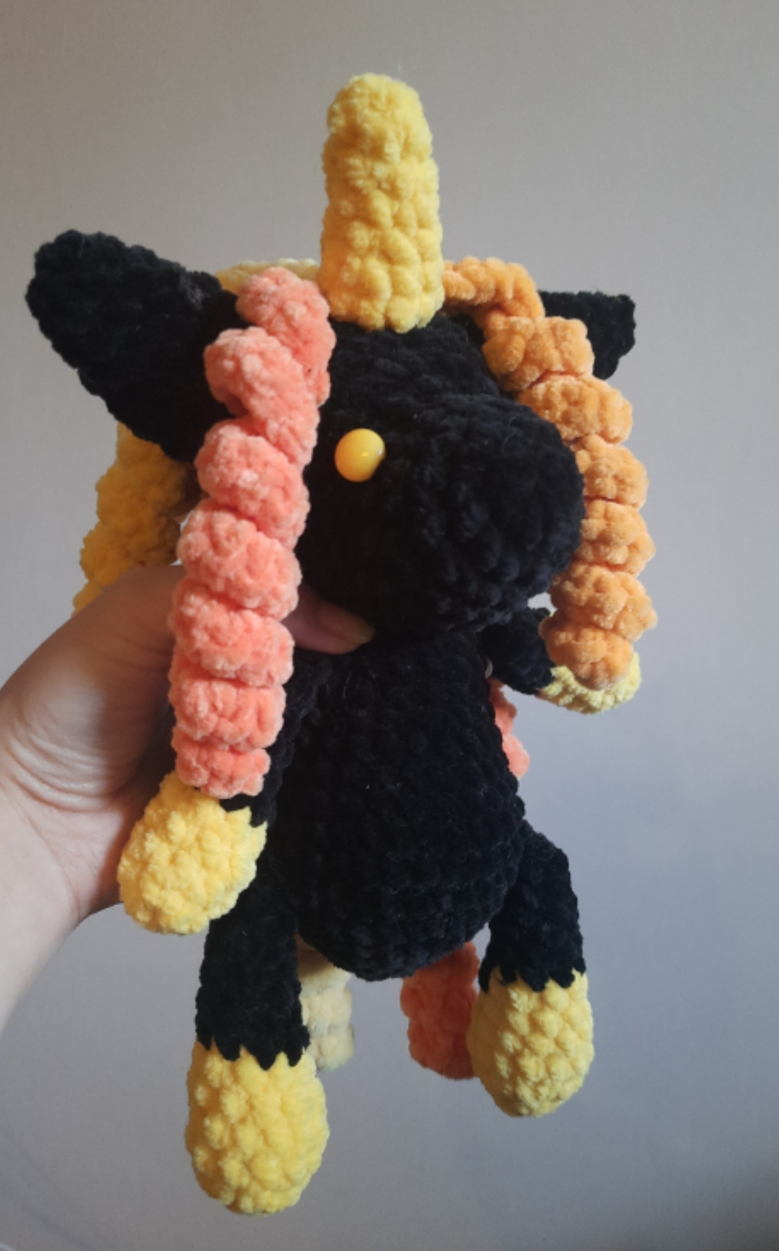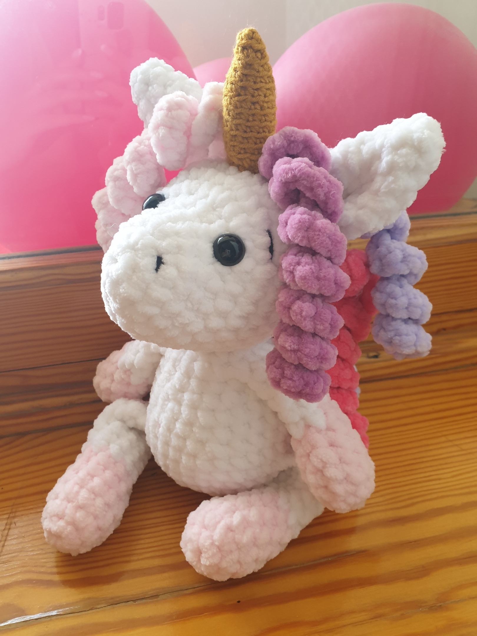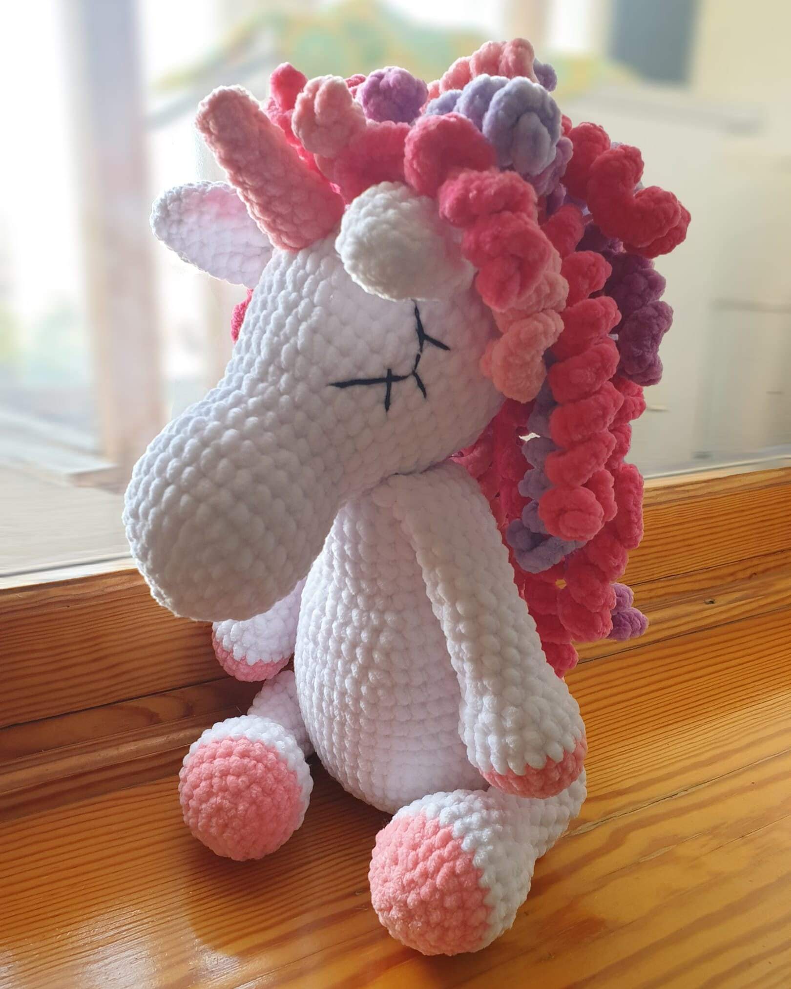 Все единороги связаны крючком из плюшевой пряжи. Первые 4 единорога - большие, 35см в высоту в сидячем положении. Два вторые единорога 23 см с ножками. Можно повторить в любых цветах и оттенках.