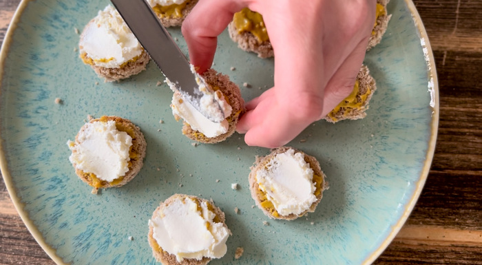 Теперь каждый кружочек хлеба смазываем горчицей. А сверху горчицы намазываем сливочный сыр.