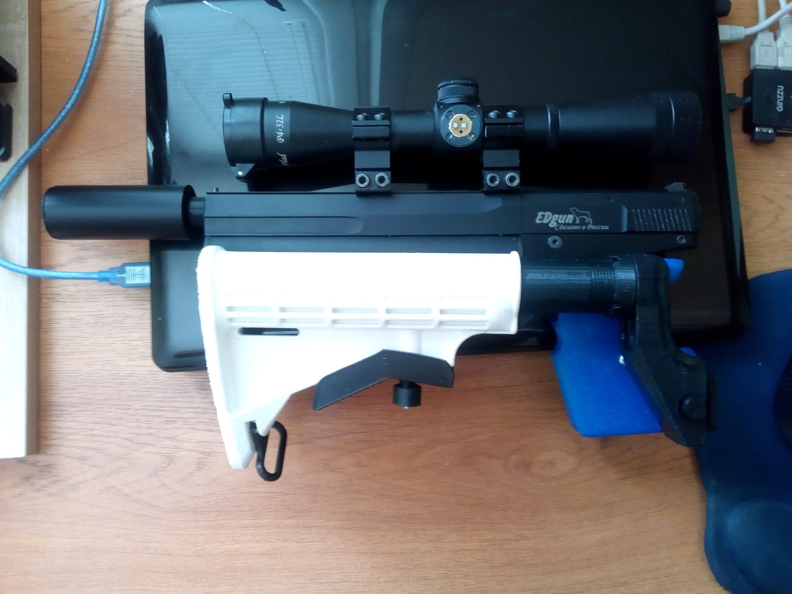 Дело в том, что найти готовую 3д модель самого телескопического приклада а ля ar-15 не составило никакого труда. Чуть больше пришлось заморочиться, чтоб найти модель узла складывания приклада с защёлкой и вписать его в конструкцию. А вот рукоятку пистолета пришлось рисовать с нуля. Да и это бы не беда. Самой главной проблемой для меня стало- подобрать угол наклона приклада относительно рукоятки. Привязаться абсолютно не к чему. Ни одна грань родной рукоятки не соосна стволу. Поэтому пришлось перепечатывать рукоятку несколько раз и подбирать угол экспериментальным путем. В итоге белый abs у меня закончился и пришлось допечатывать из того, что было. В общем, хотел как лучше, а получилось- как всегда:)
