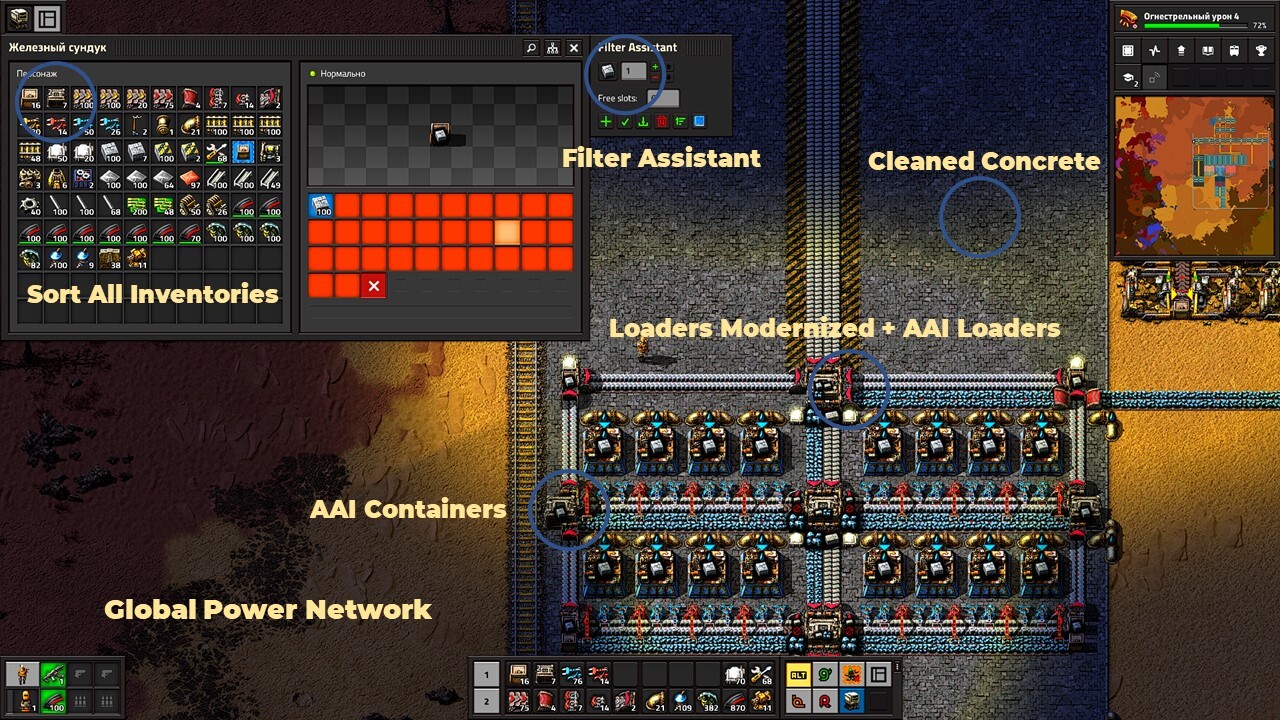 Loaders Modernized - отличный погрузчик для хранилищ. Позволяет устанавливать фильтры на вход и выход и разделять продукцию на конвейере. Мне не понравилось визуальное представление модели, поэтому я использую графику погрузчика из AAI Loaders. Это возможно благодаря настройкам модов, ничего самому кодить не надо.