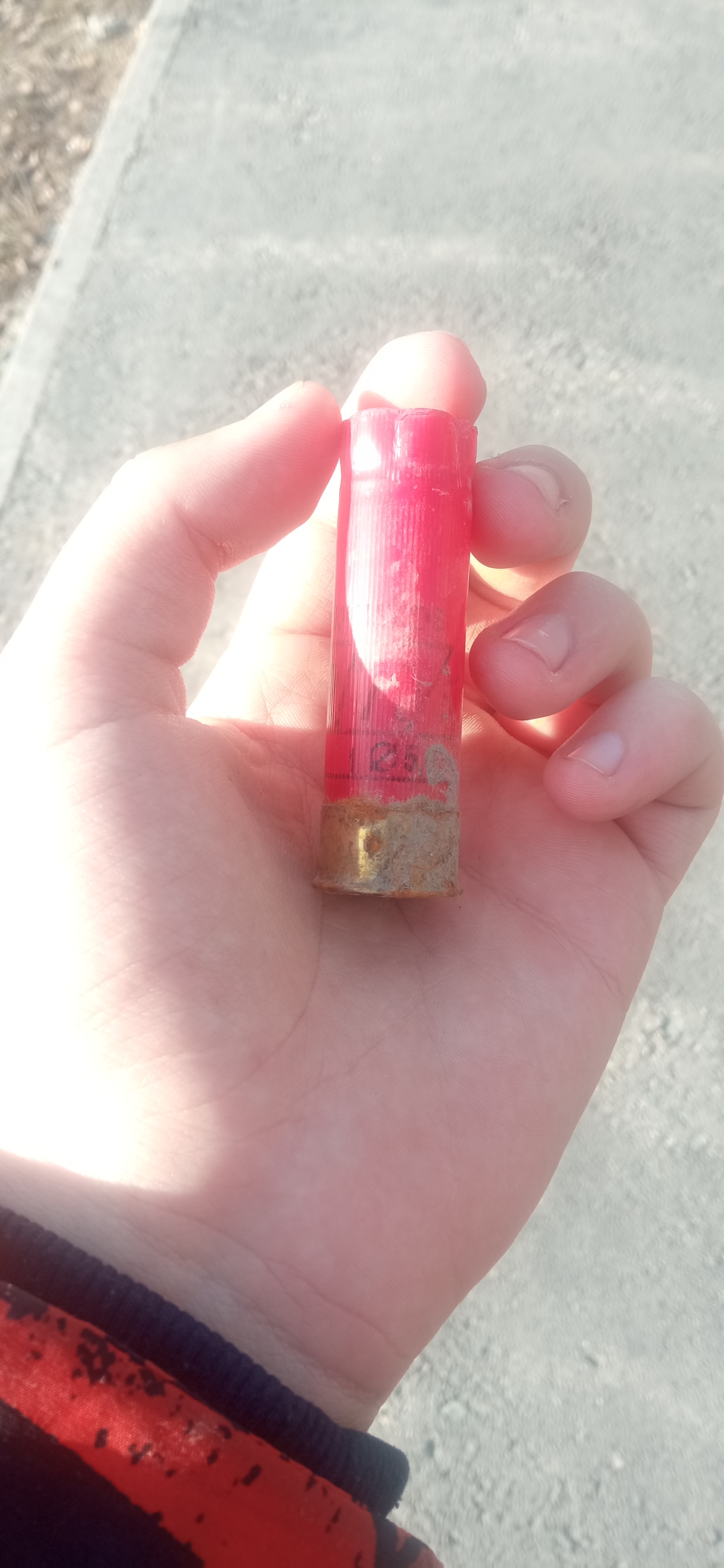 3. Гильза от дробовика. Иду значит с остановки и вижу в траве что-то красное, поднял. Маркировка даже осталась.