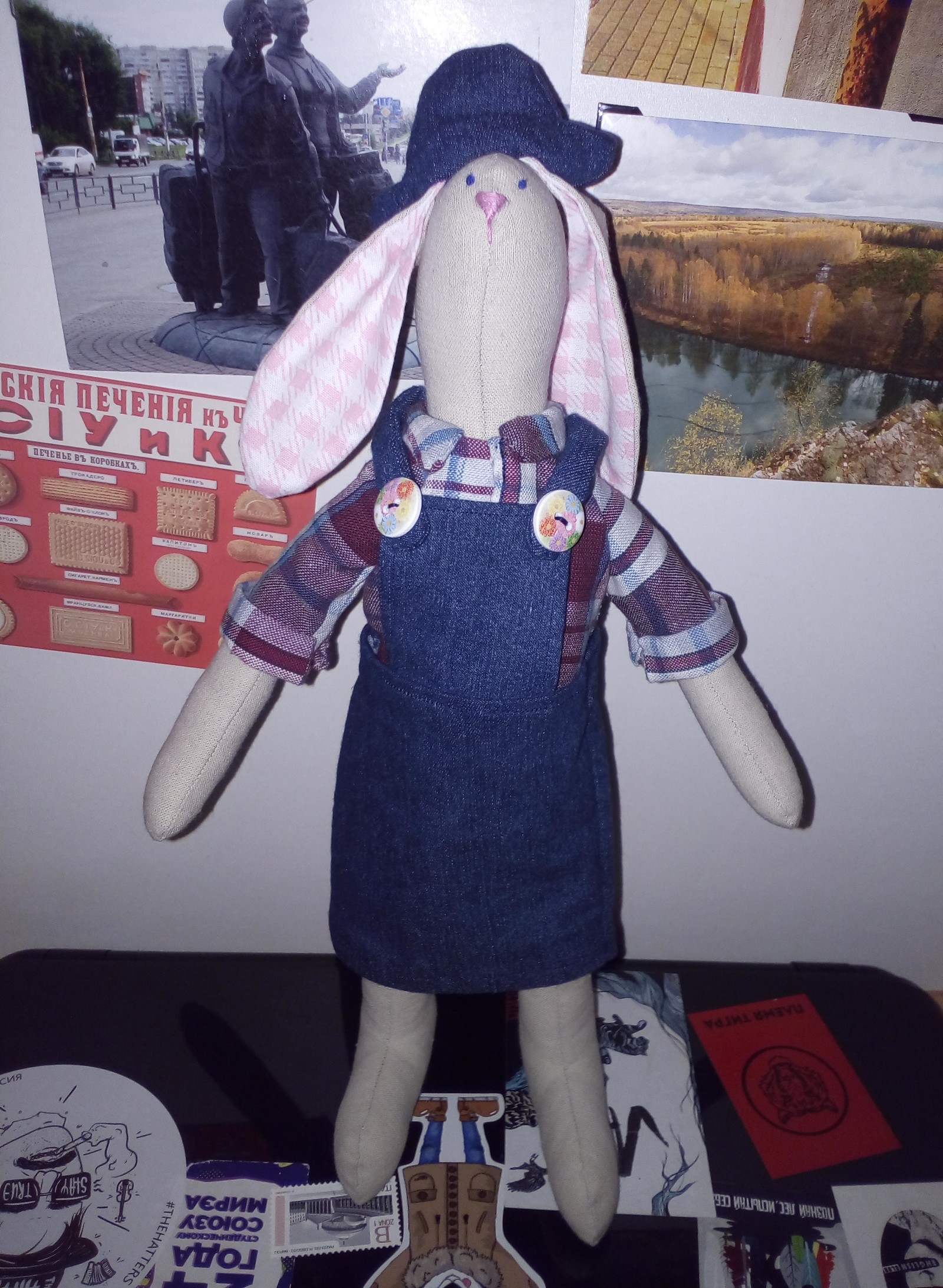 Эта зайчиха была сшита в подарок подруге на день рождения. Идея пришла крайне внезапно и почти в последний момент. Ворот рубашки получился немного странным, но саму рубашку я перешивала несколько раз и на него уже просто не хватило времени(