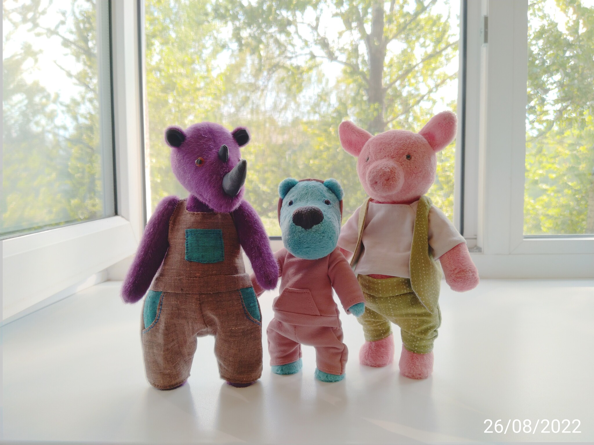 Материалы: искусственный мех, кожзам, кожа, хлопок, футер; в качестве набивки опилки и стеклянный гранулят.