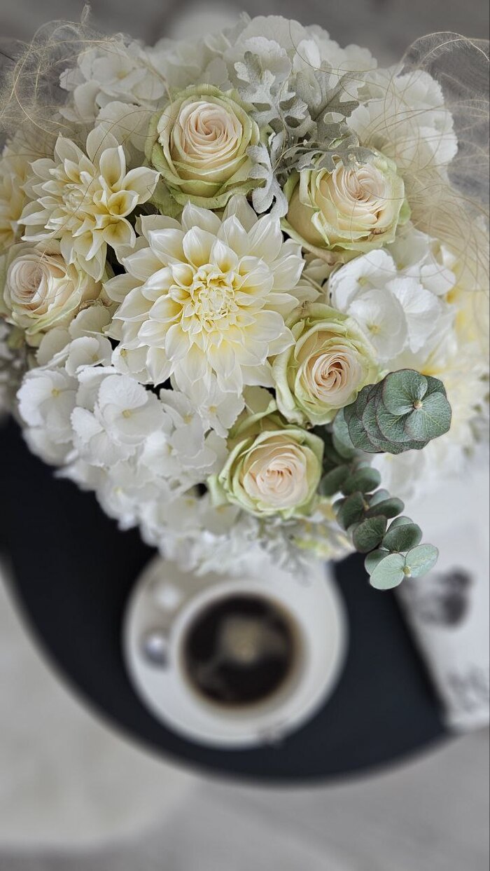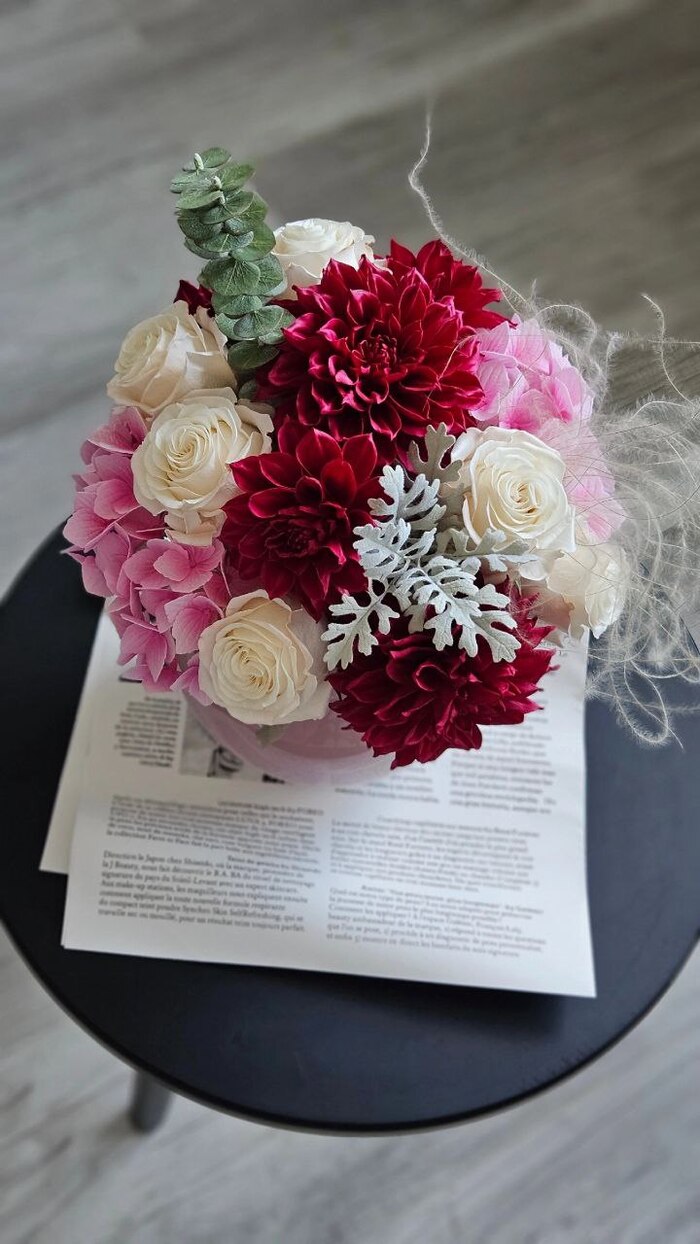 Состав композиции: георгины, розы, гортензия, цинерария, эвкалипт (пушистые веточки это сухоцвет).
