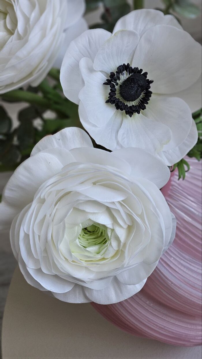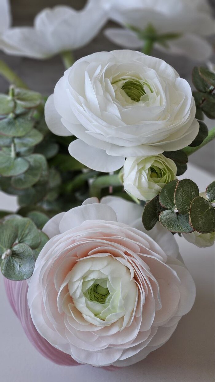 Ранункулюсы, анемоны, эвкалипт. Тычинки анемонов слеплены вручную из холодного фарфора.