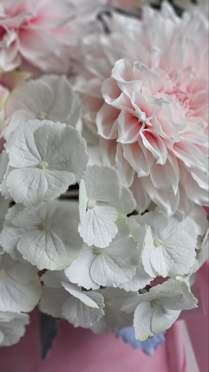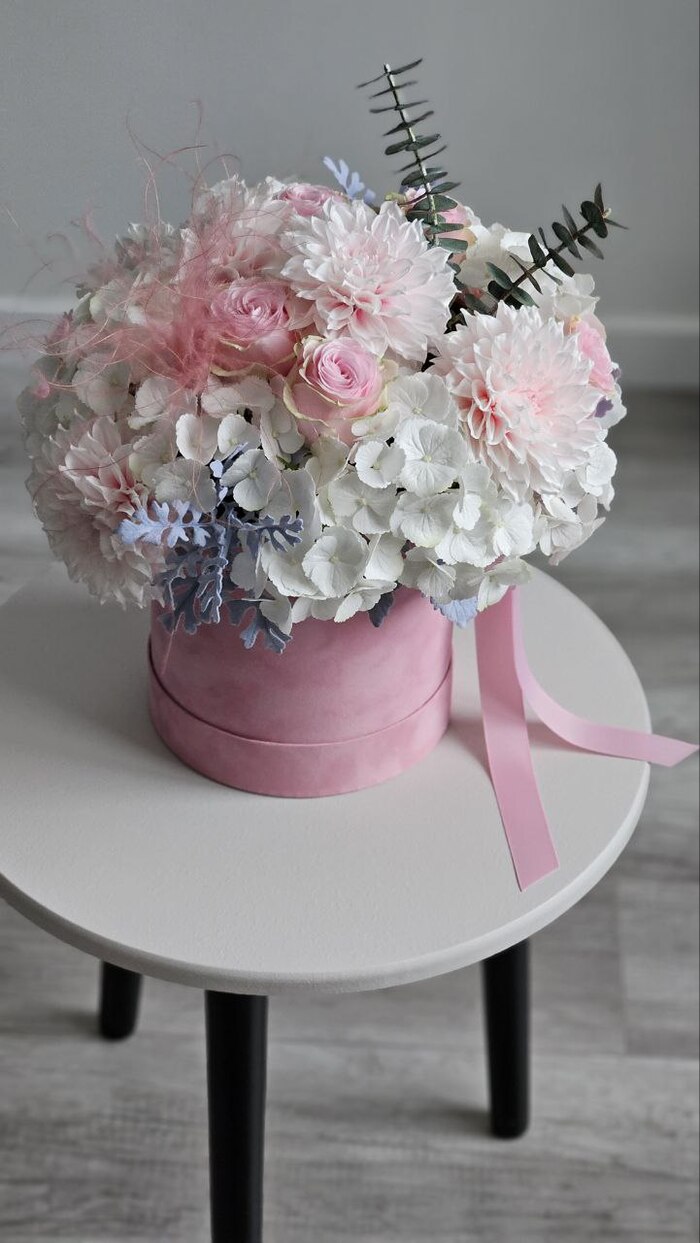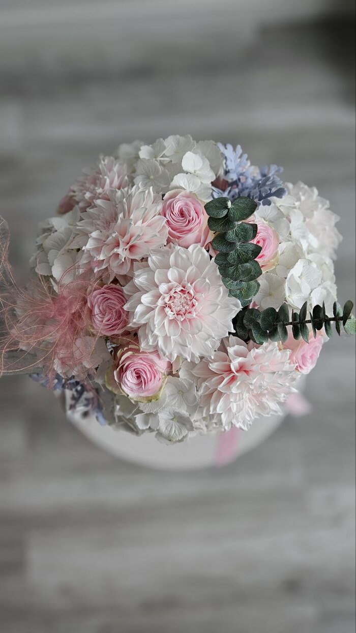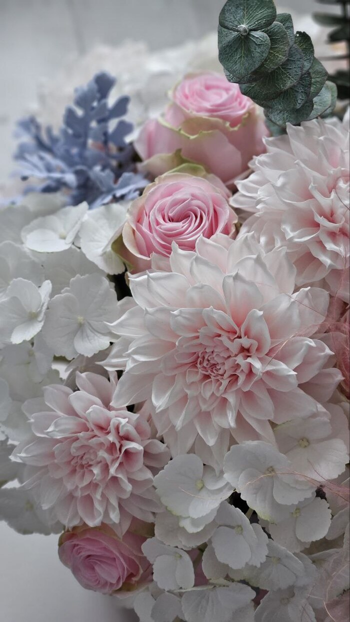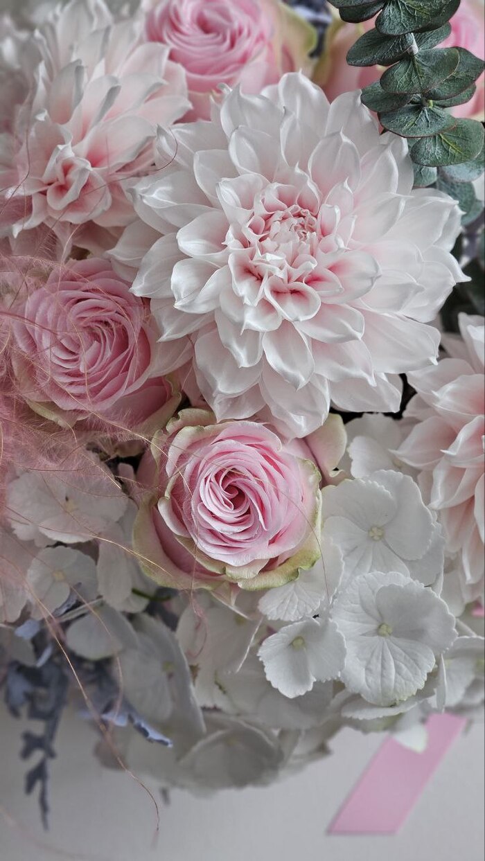 Георгины, розы, гортензия, цинерария, эвкалипт.