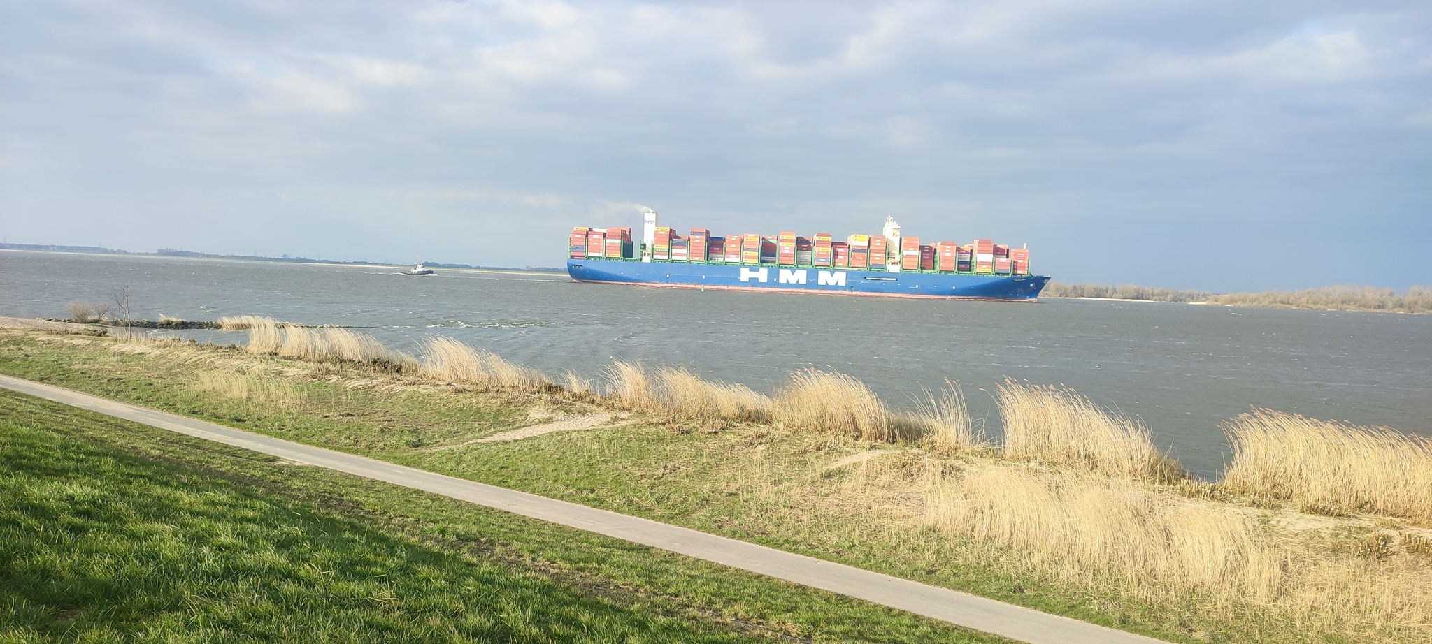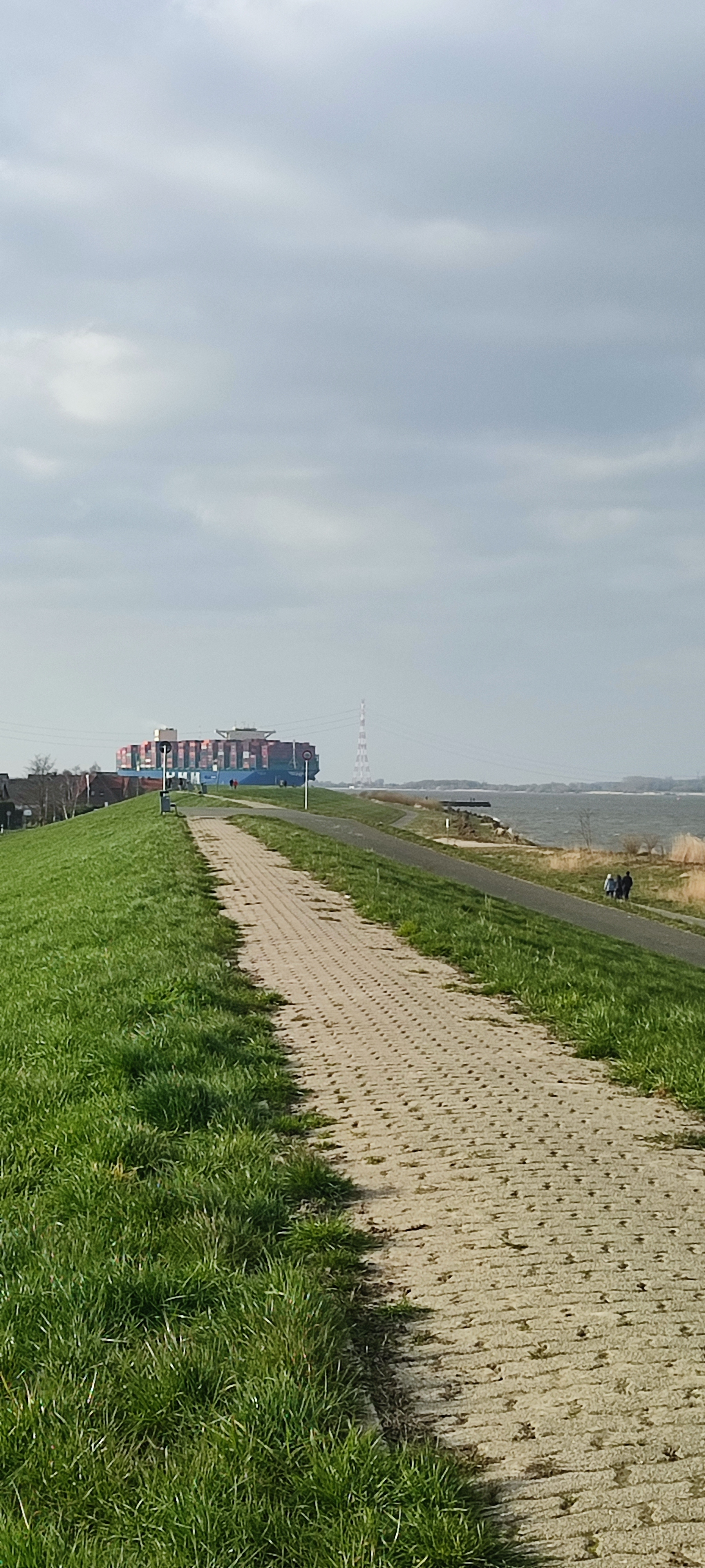 Наверху насыпи дорожка скамеечки и вид на реку Эльба. Ну и на суда идущие в порт Гамбурга.