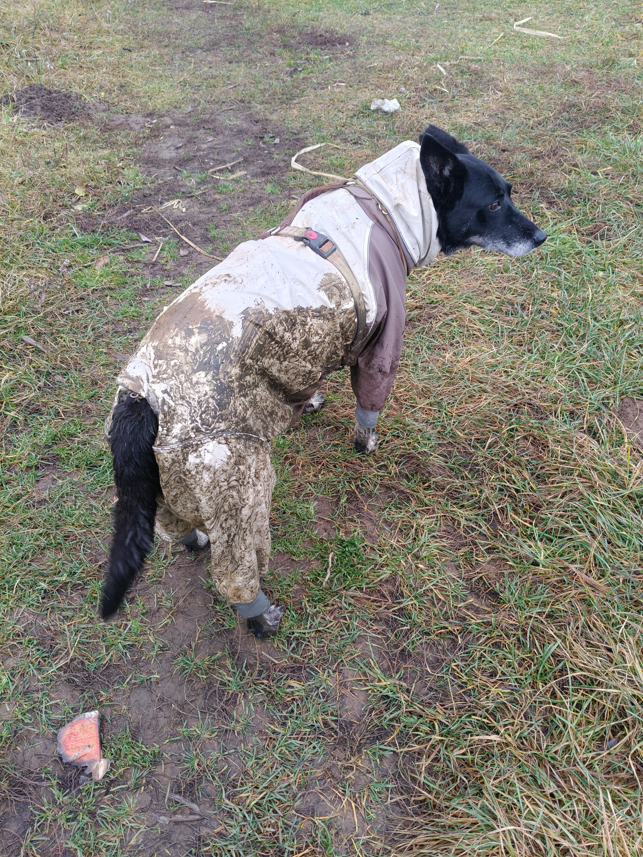 В конце концов мы дошли до норы, которую Чуча потихоньку копает почти 10 лет. Собака сразу полезла проверять состояние норы и обновлять раскоп. Потом раздался хруст и тишина. Я пошёл проверить в чём дело. В общем собака начала вылезать из норы задним ходом, запуталась в камыше и упала правым боком в грязь. Грязь с радостью приняло Чучу в свои объятья и не отпускала.