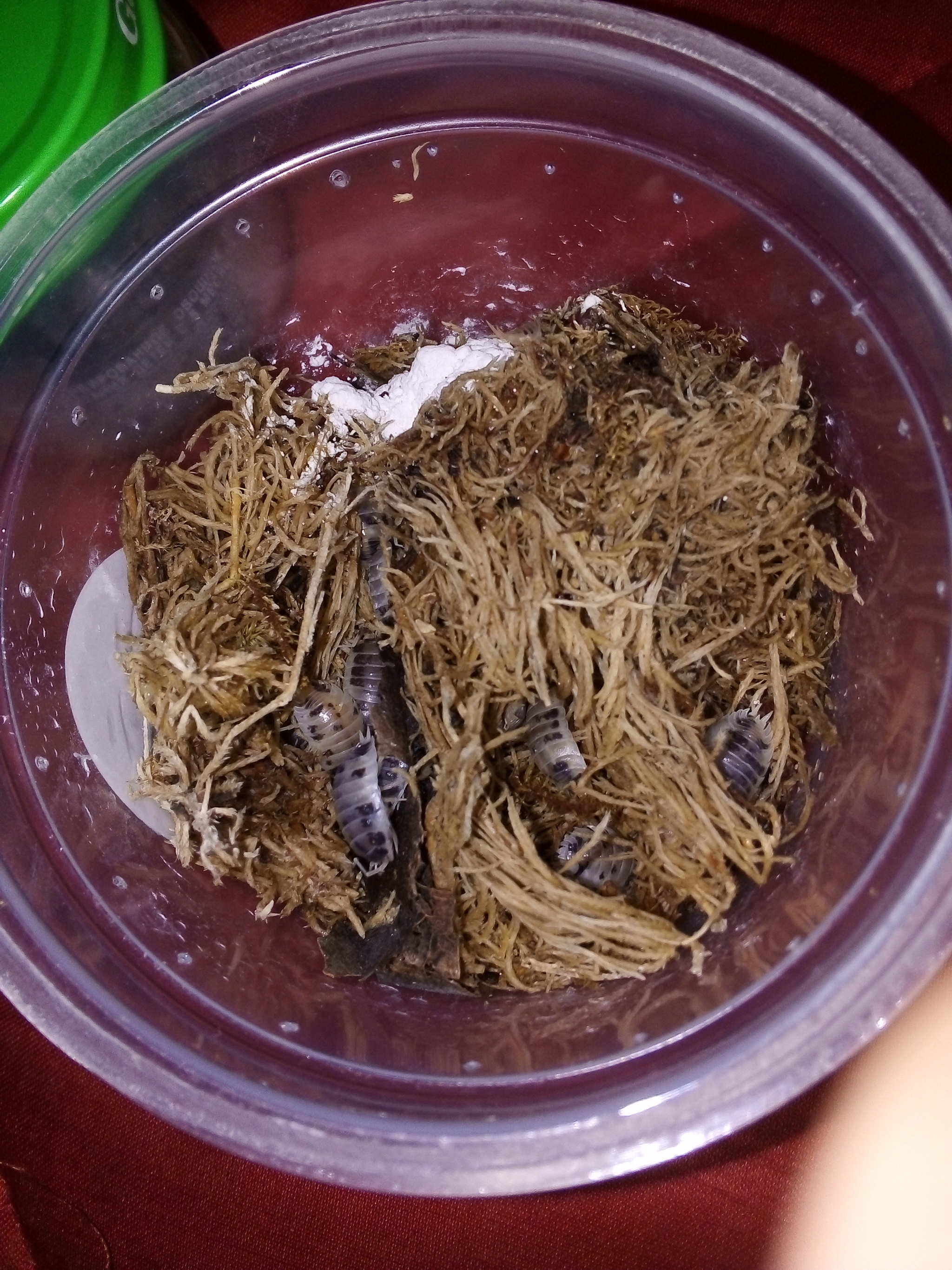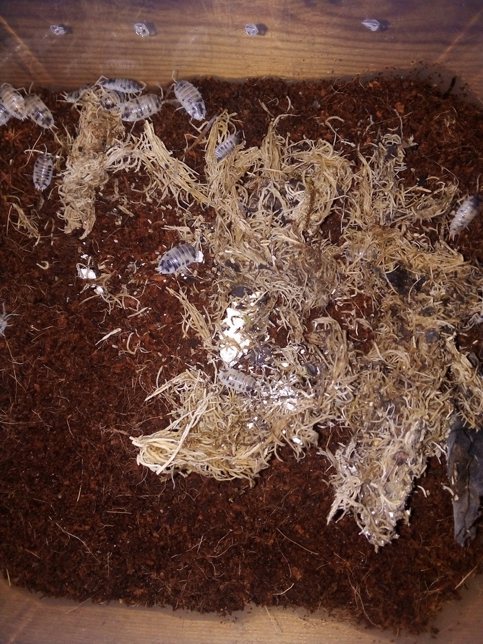 Мои новые питомцы мокрицы Diary Cow, купил в колличестве 20 штук, несколько самок ждали потомство. На данный момент уже есть много крошечных мокричек размером примерно 2мм. Кормлю капустой, огурцом и гамарусом. Есть кокос отказались, от кокосовой скорлупы в качестве укрытия тоже, больше любят прятаться в мох сфагнум. В дальнейшем планирую купить еще пару видов и заняться селекцией.