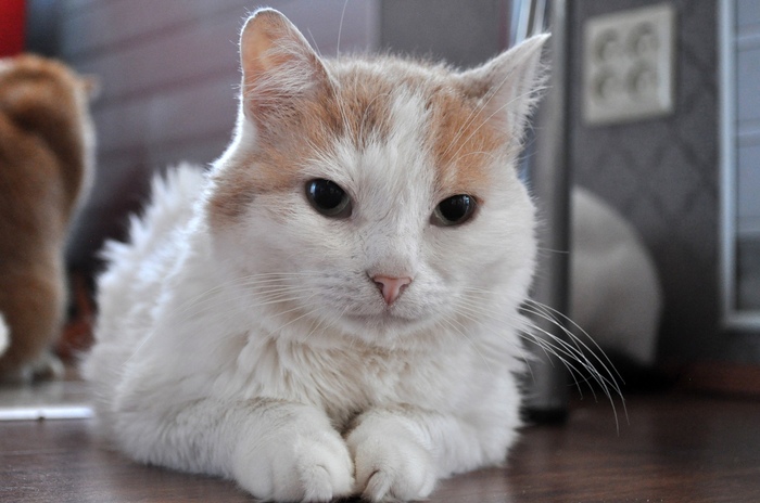 Говорят, что его подрали местные собаки, очень сильно. Работница магазина спрятала его в подсобке магазина, где он несколько дней отлеживался, думали уже не выживет. Но хозяин узнал о коте и приказал избавиться от "недоразумения". Несмотря на то, что ему стало лучше, он не смог бы выжить на улице. Передняя лапа была сильно травмирована и загноилась, он плохо передвигался, был истощен и не смог бы в случае чего убежать от врагов.