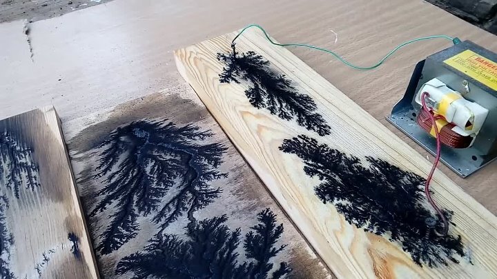 В искровых каналах сильного разряда возникают высокие давления и температуры, которые деформируют поверхность диэлектрика, запечатлевая на ней фигуры Лихтенберга.