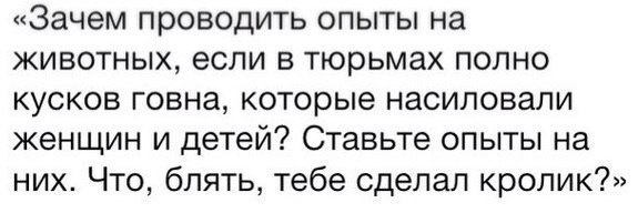 Плюсую. Животные невинны по своей сути. В тоже время АУЕ-мусор не жалко и на опыты пустить.