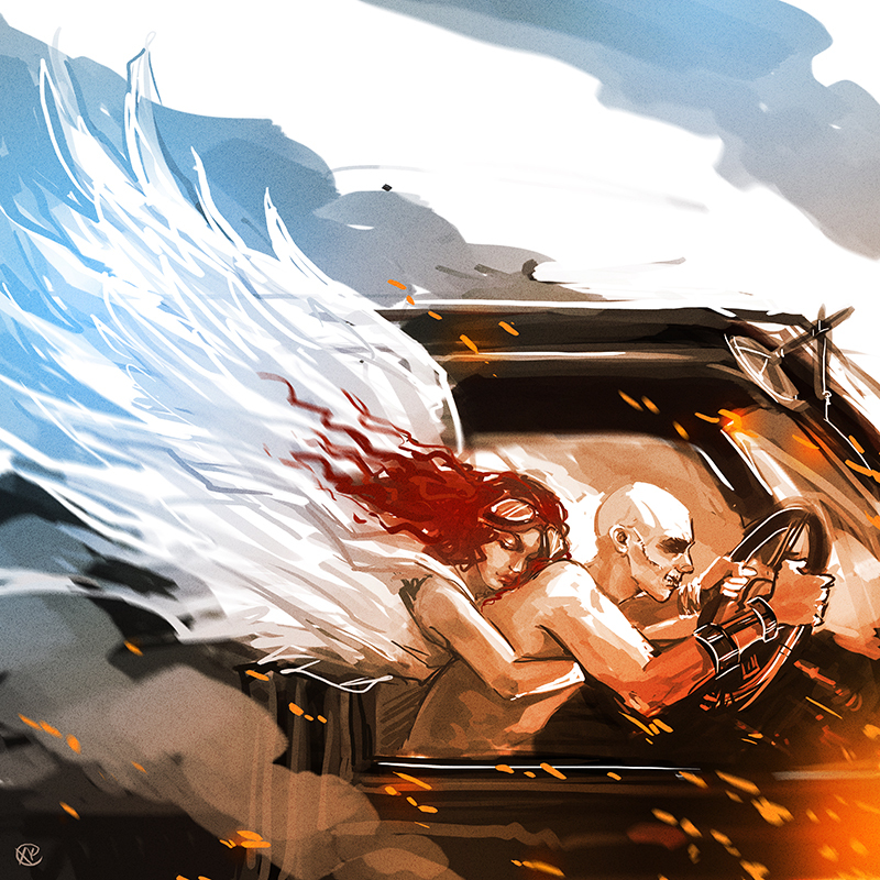 Суть: Nux едет в машине или фуре, а Capable (Девушка с красными волосами) в образе ангела следует за ним. Кажется рисунок был сделан непосредственно пикабушником.