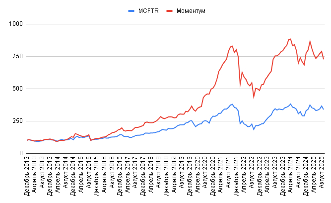 Среднегодовая доходность стратегии Моментум за 10 лет 21,9%.