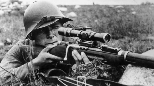 Ещё по этой фотографии такая информация: "Советский снайпер на огневой позиции в августе 1941 года. Красноармеец вооружен снайперской винтовкой Мосина с оптическим прицелом ПЕ образца 1931 года, стоит отметить так же каску-«халкинголку» СШ-36 (Стальной шлем 1936)." http://nnm.me/blogs/shamba/rasskaz-o-rukopashnoy/