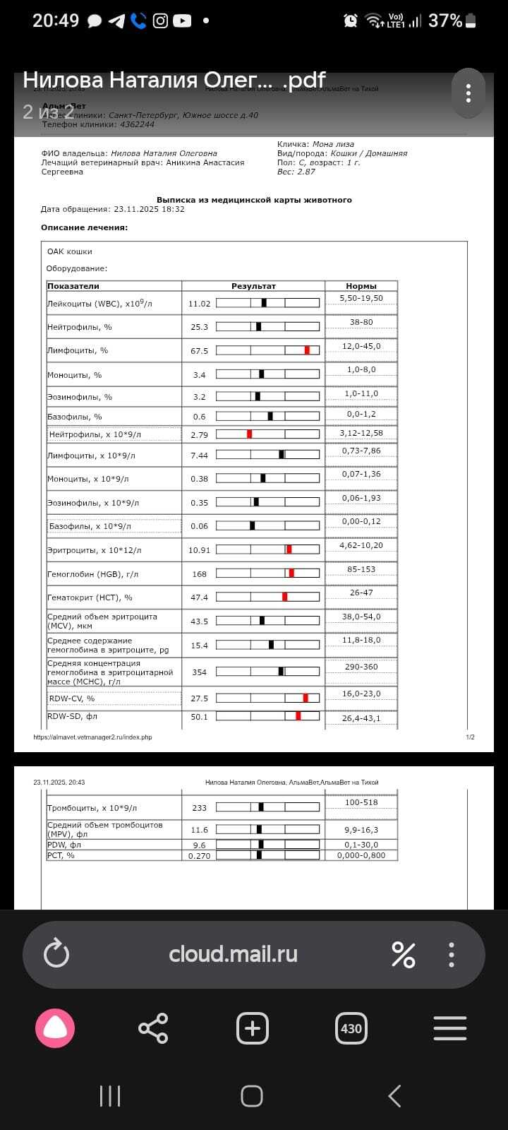Позавчера были в клинике Альмавет : температура нормальная, признаков инфекции нет.