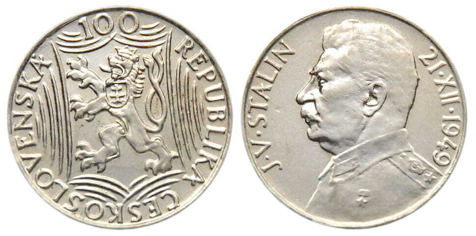В 1949 году Чехословакия выпустила две монеты, посвященные 70-ти летию Сталина И.В. - 50 и 100 крон. Тираж каждой монеты - 1 млн экземпляров.