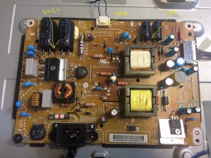 По напряжениям на емкостях после диодного моста по 300 вольт, на ножках диодного моста - по +-130, переменка от разъема до него же примерно так же. На конденсаторах на 200 вольт напряжение 140 вольт, а на питании подсветки - 104 В, на корпус не замкнуто