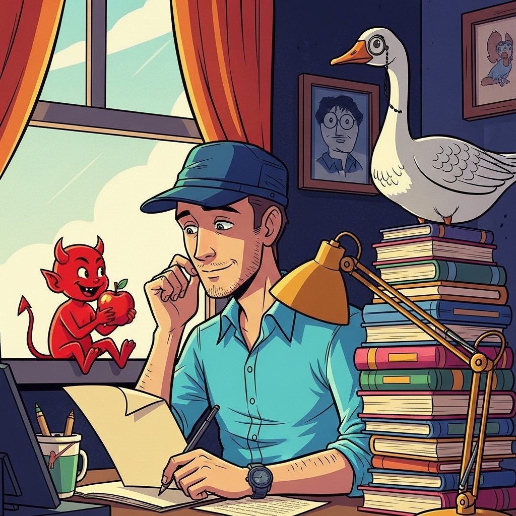 Сцена: пыльный кабинет Автора, заваленный рукописями и кофейными кружками. Автор, в мятой рубашке, чешет затылок, глядя на пустой лист. Чертик, с рогами, начищенными до блеска, лениво развалился на подоконнике, жуя яблоко. В углу, на стопке книг, восседает Гусь Когито — надменный, с моноклем на глазу, полируя перья.