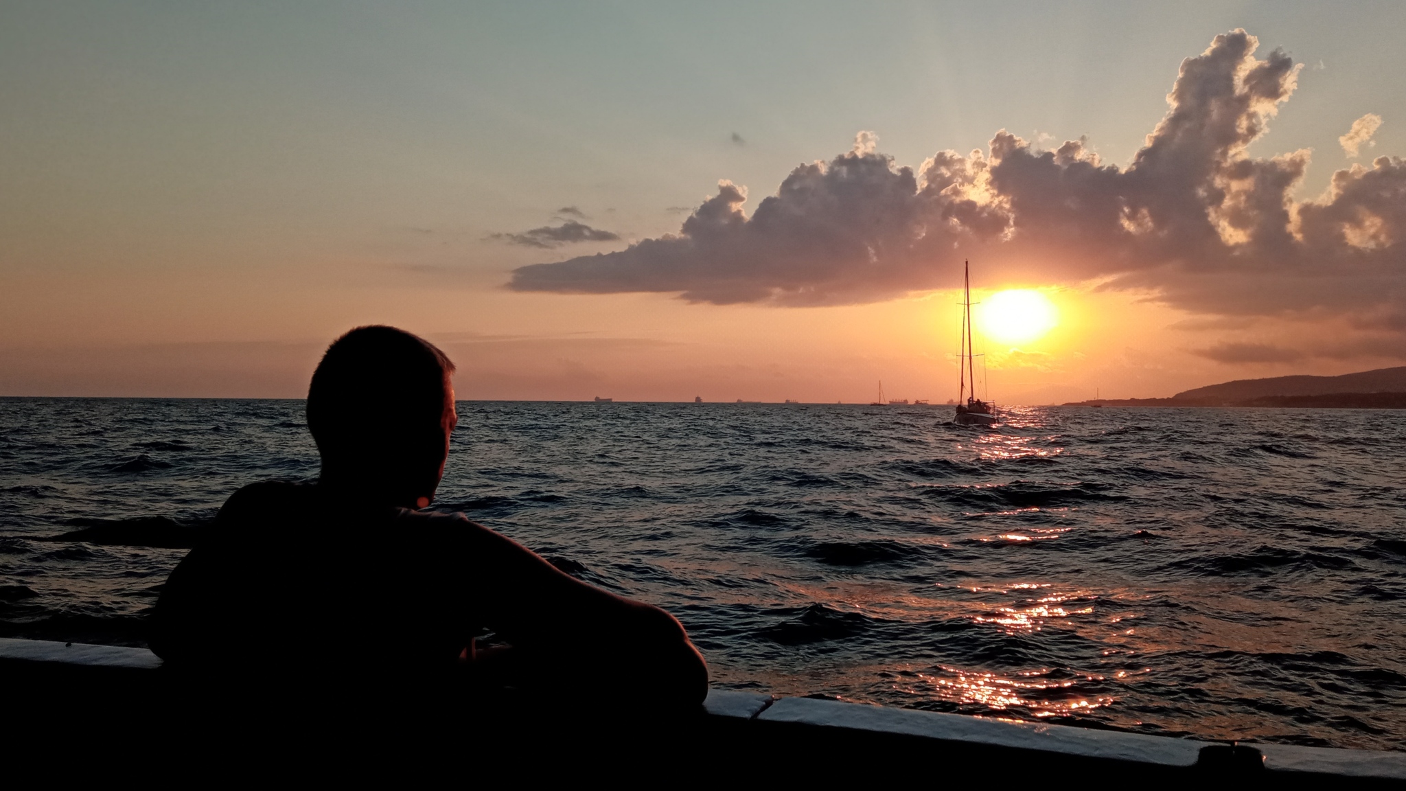 Пляж не особо впечатлил, потому что много посудин там плавает (ходит?) и плёнка из ГСМ на поверхности моря не вызывает желания искупаться. Кстати, на одном экскурсионном кораблике покатались и были очень довольны. Вид на бухту на закате просто шикарный!