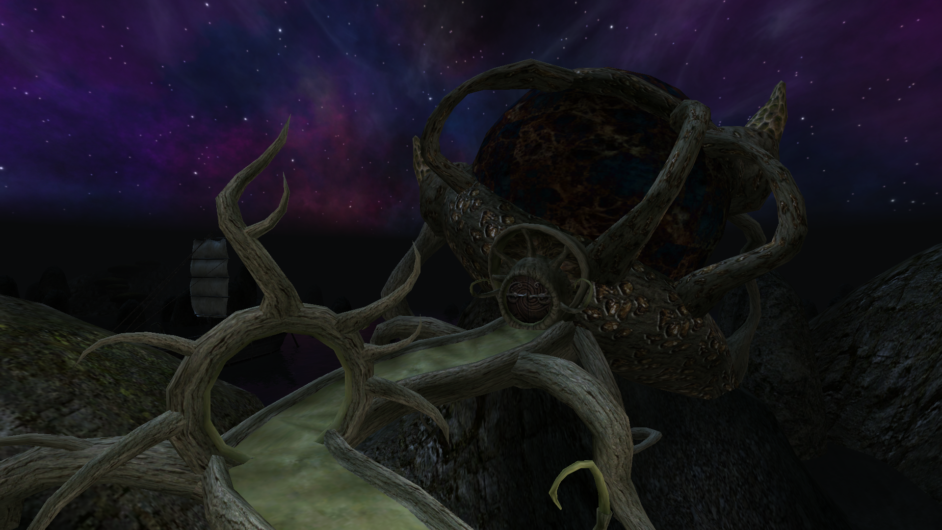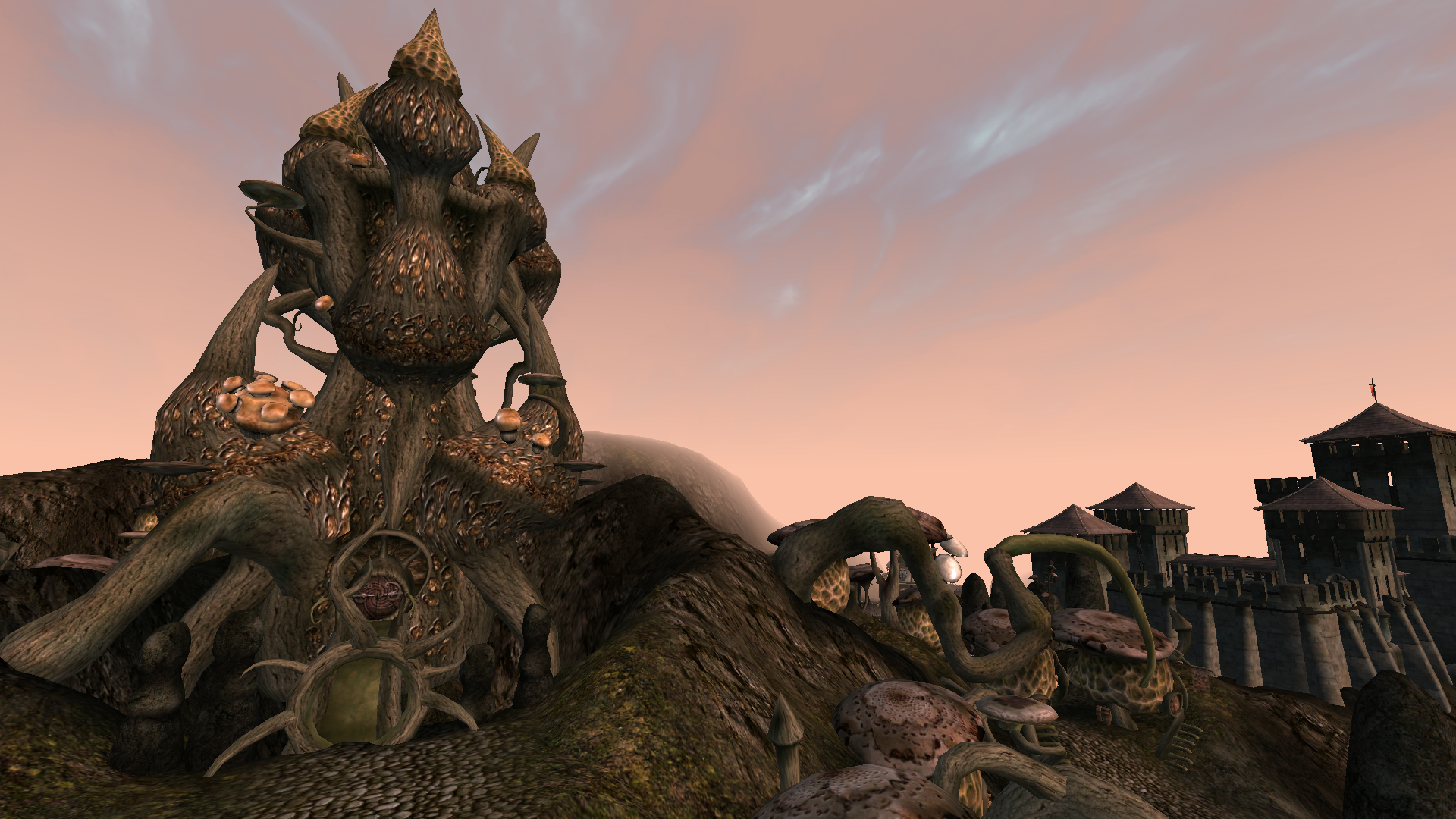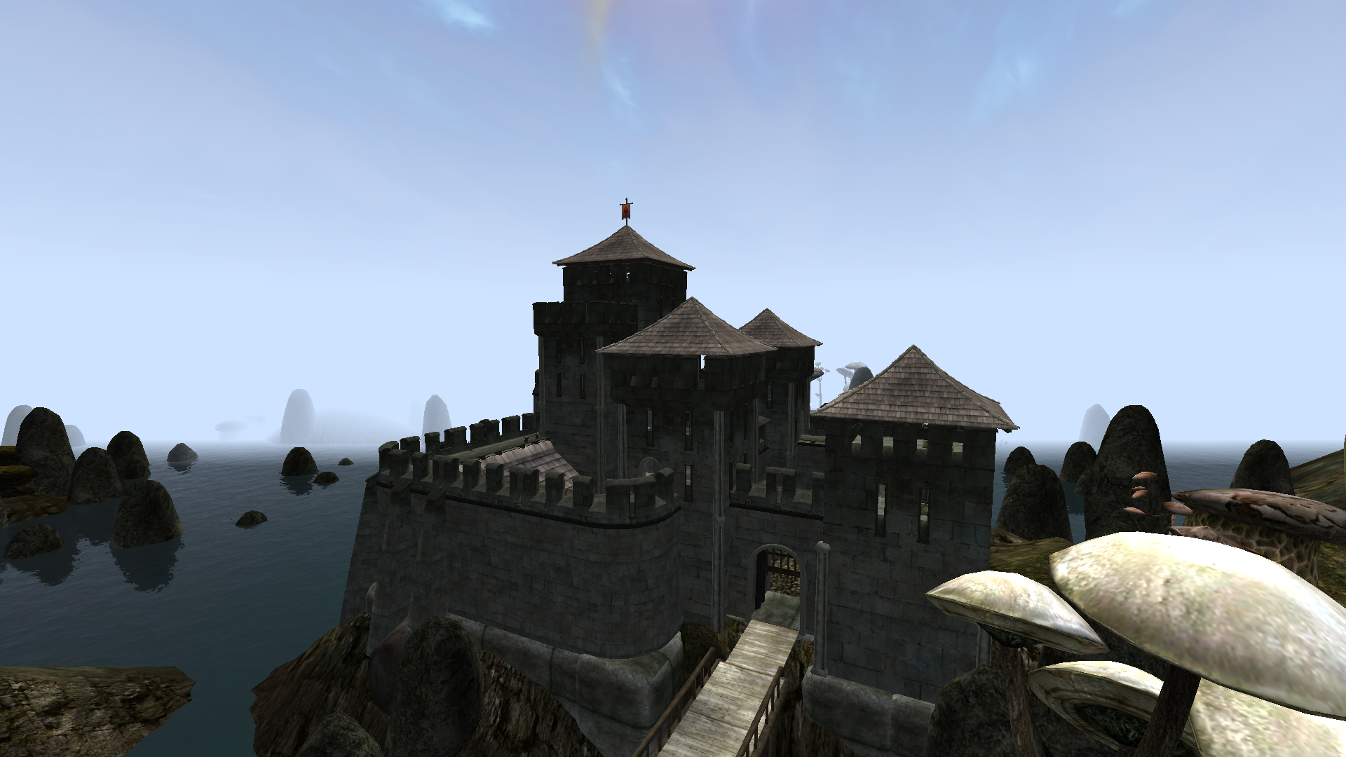 Толстые серые стены, угловатые башни, строгие ворота - всё это чуждо мягким органическим формам Садрит Моры. Крепость стоит на островке к востоку от главной грибной массы города, и добраться туда можно лишь по мосту.
