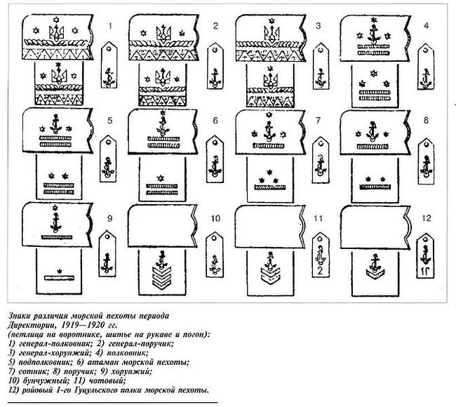 Особняком в украинской армии стояла морская пехота, созданная уже тогда, когда войска Директории были отброшены красными от Черного моря. 1-й полк морской пехоты был детищем как УНР, так и Западно-украинской народной республики, поскольку создавался из надднепрянских пехотных офицеров и гуцулов, которые легко управлялись с лодками и плотами на быстрых карпатских речках, и в Австро-Венгрии считались хорошими моряками. Полк комплектовался весной 1919 года в Станиславе (ныне – Ивано-Франковск), где официально стал именоваться Гуцульским.