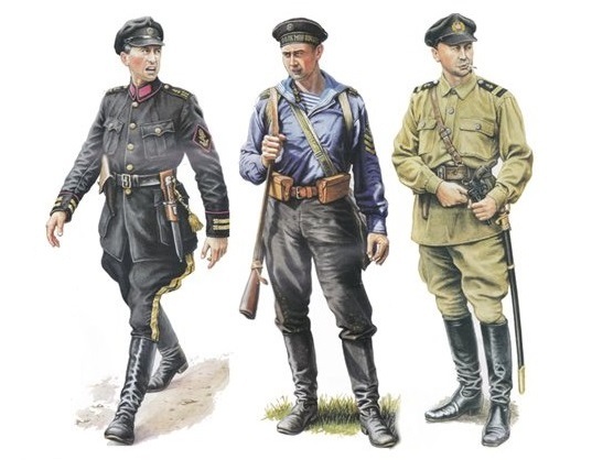 3. Знаки различия для офицеров – золотые, нашитые на обеих рукавах, такие же как в УГА , для унтер-офицеров желтые, нашитые на левый рукав под желтым якорем: один угол у роевого, два – у четового, три – у бунчужного.