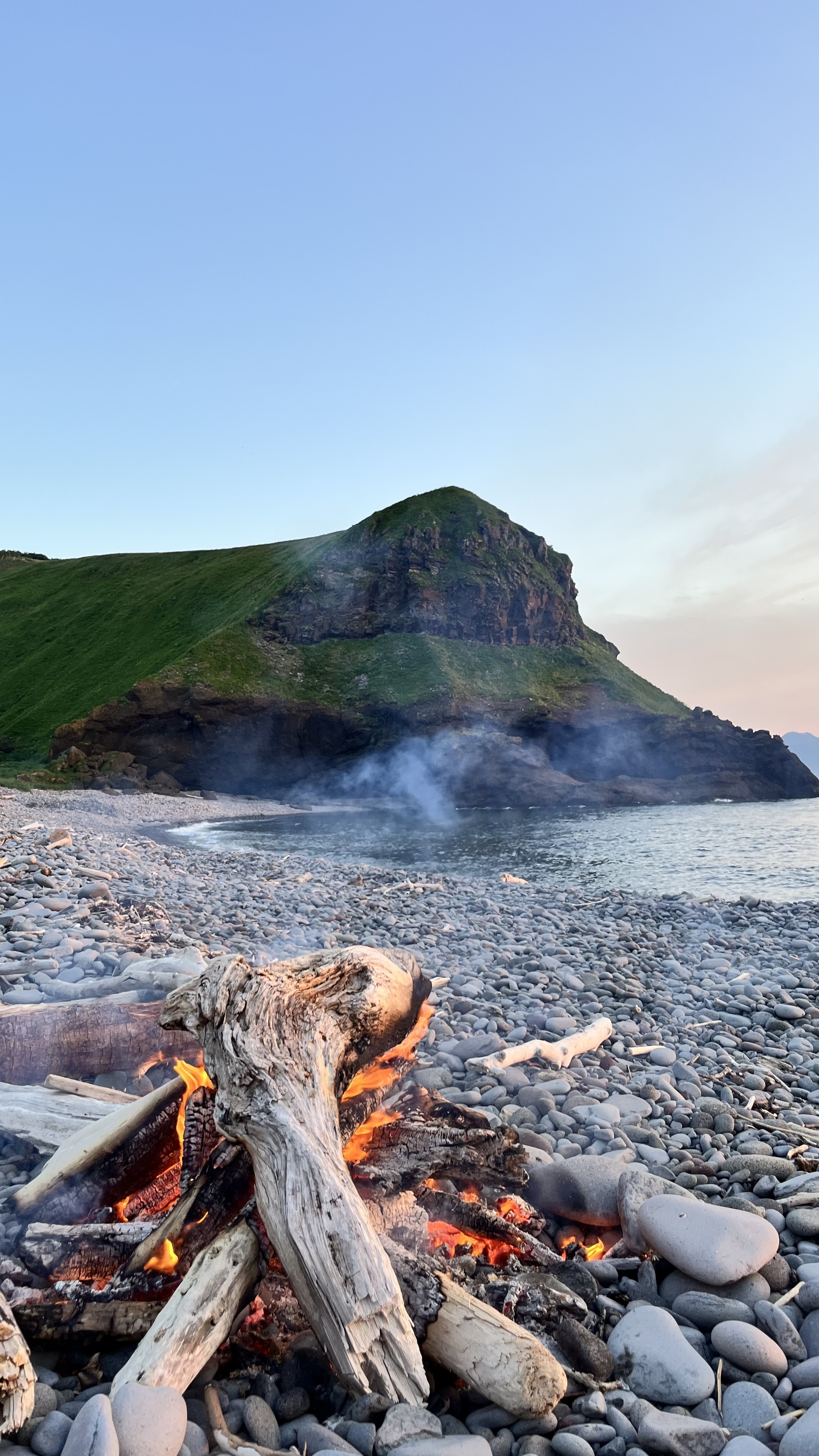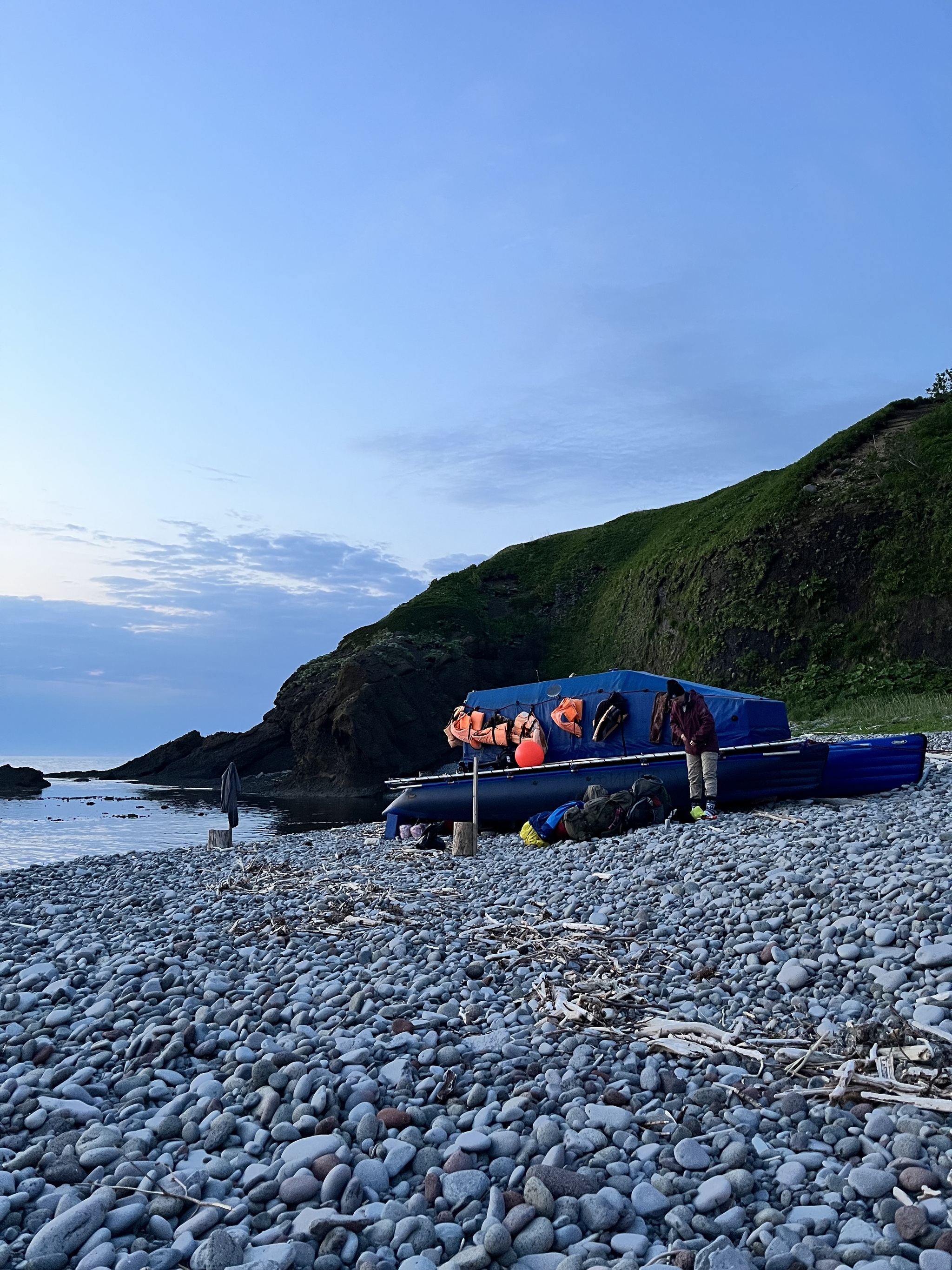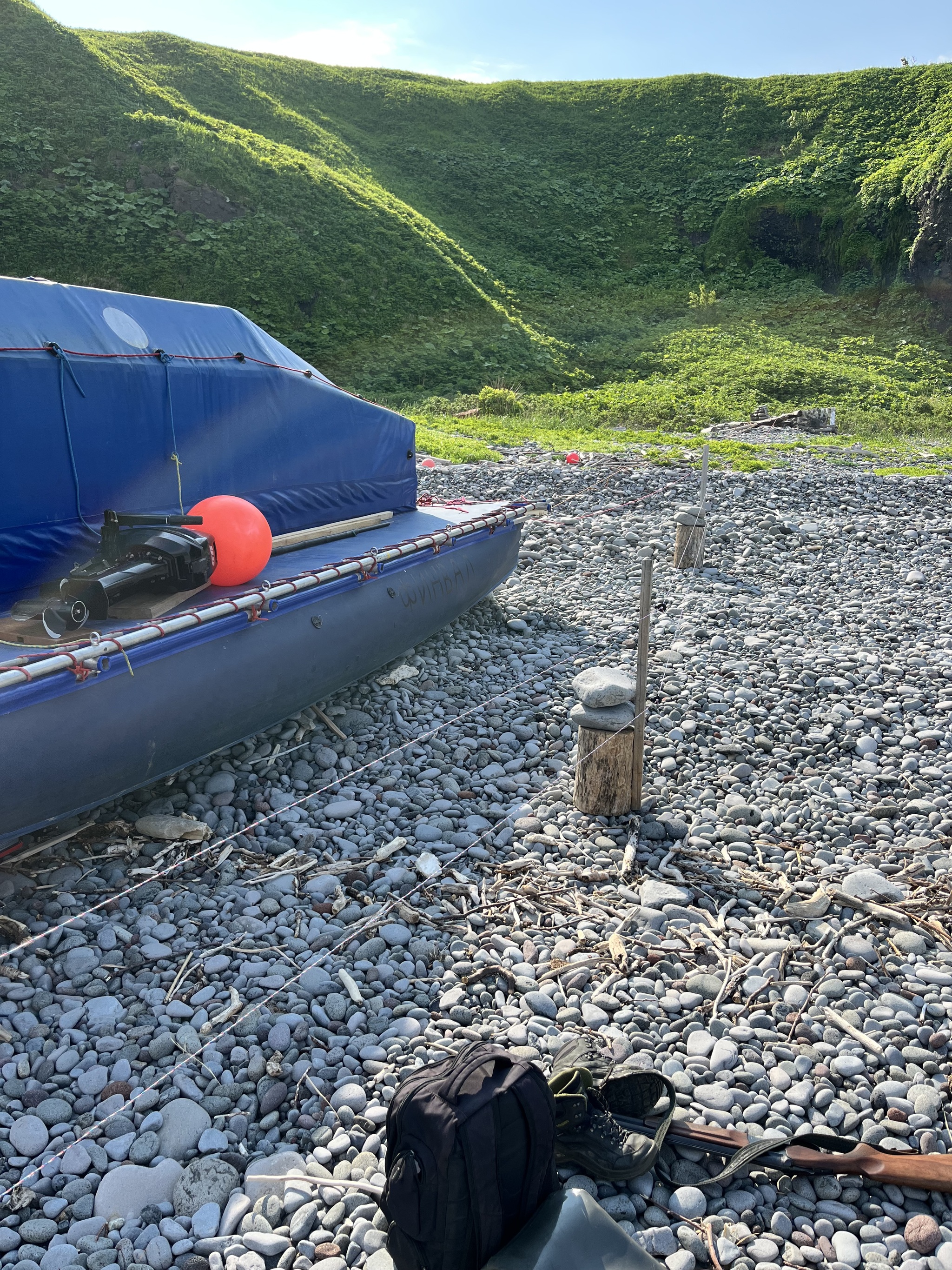 Когда тримаран был на берегу, мы поужинали и приступили к установке электропастуха. Это такое устройство, которое представляет из себя повышающий трансформатор, работающий от аккумулятора 12В, при прикосновении к ограждению оно нехило так пощипывает, наверно как от мегаомметра или еще сильнее. Мы оградили тримаран по периметру, оставим его под охраной до конца смены для защиты от лис и медведей. Начинает темнеть, мы поужинали и готовимся ко сну, наслаждаемся первым закатом и вечерним костром, сушим влажную одежду. Утомившись за день, у костра не задерживаемся, зная что завтра тяжелый день - день подъема вещей на территорию биостанции, которая станет нашим приютом на три недели. На этом наша морская прогулка закончилась. Спокойной ночи, Итуруп.