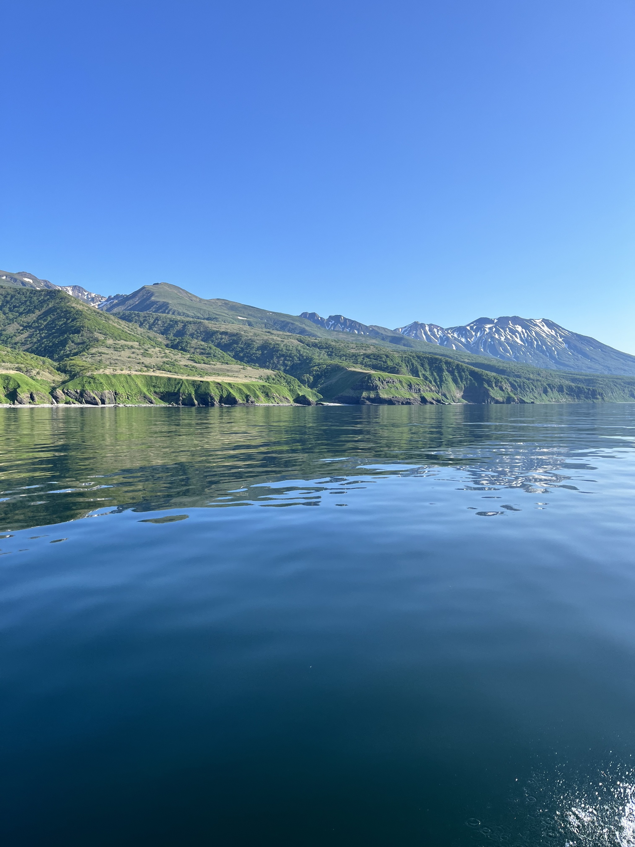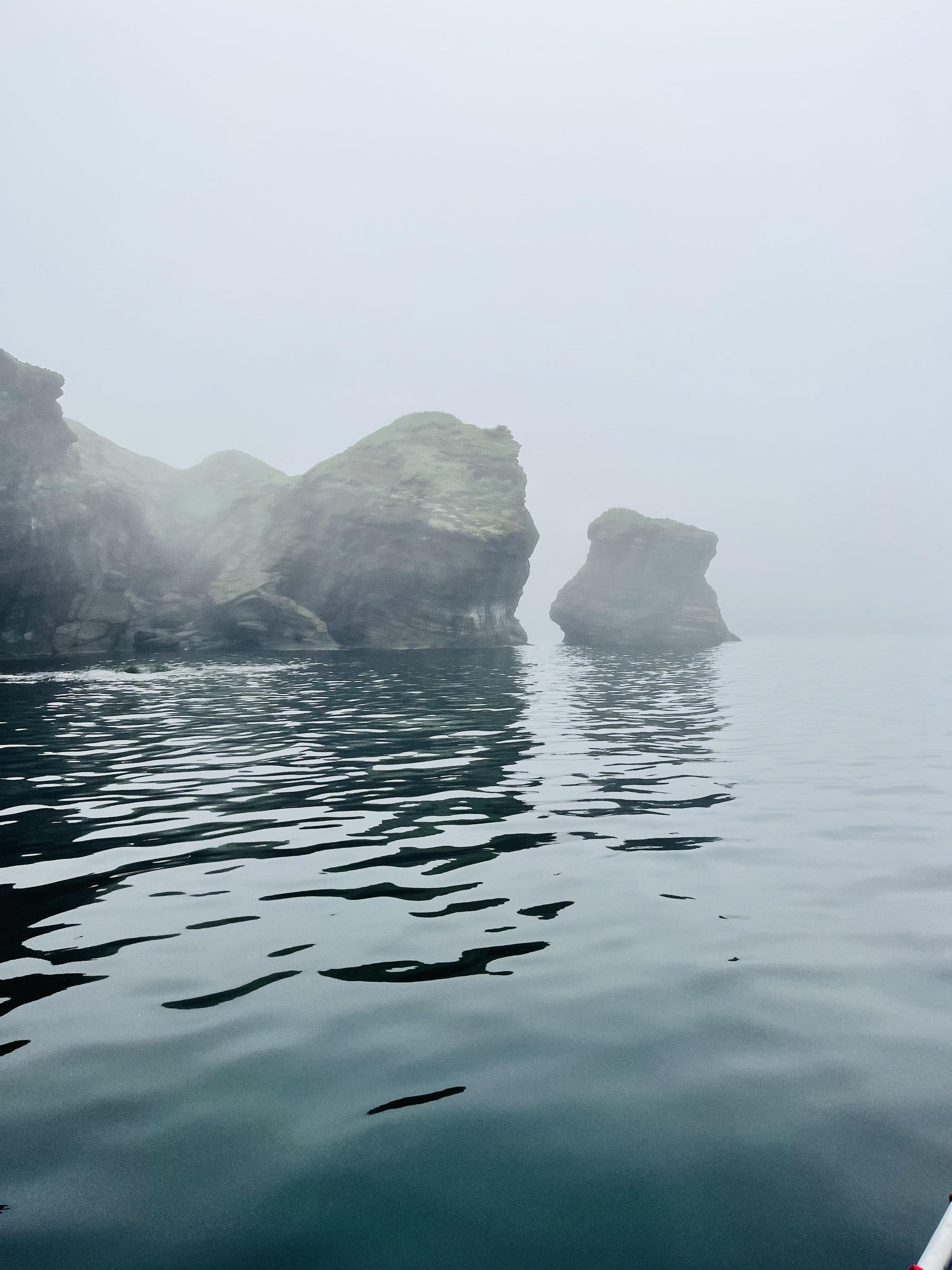Когда мы доплыли до Куйбышевского залива туман ушел, видимо его сдувало океанским ветром проходящим через остров из залива Касатки. На море была лишь небольшая зябь, а к концу маршрута вода была как зеркало, очень очень красиво.