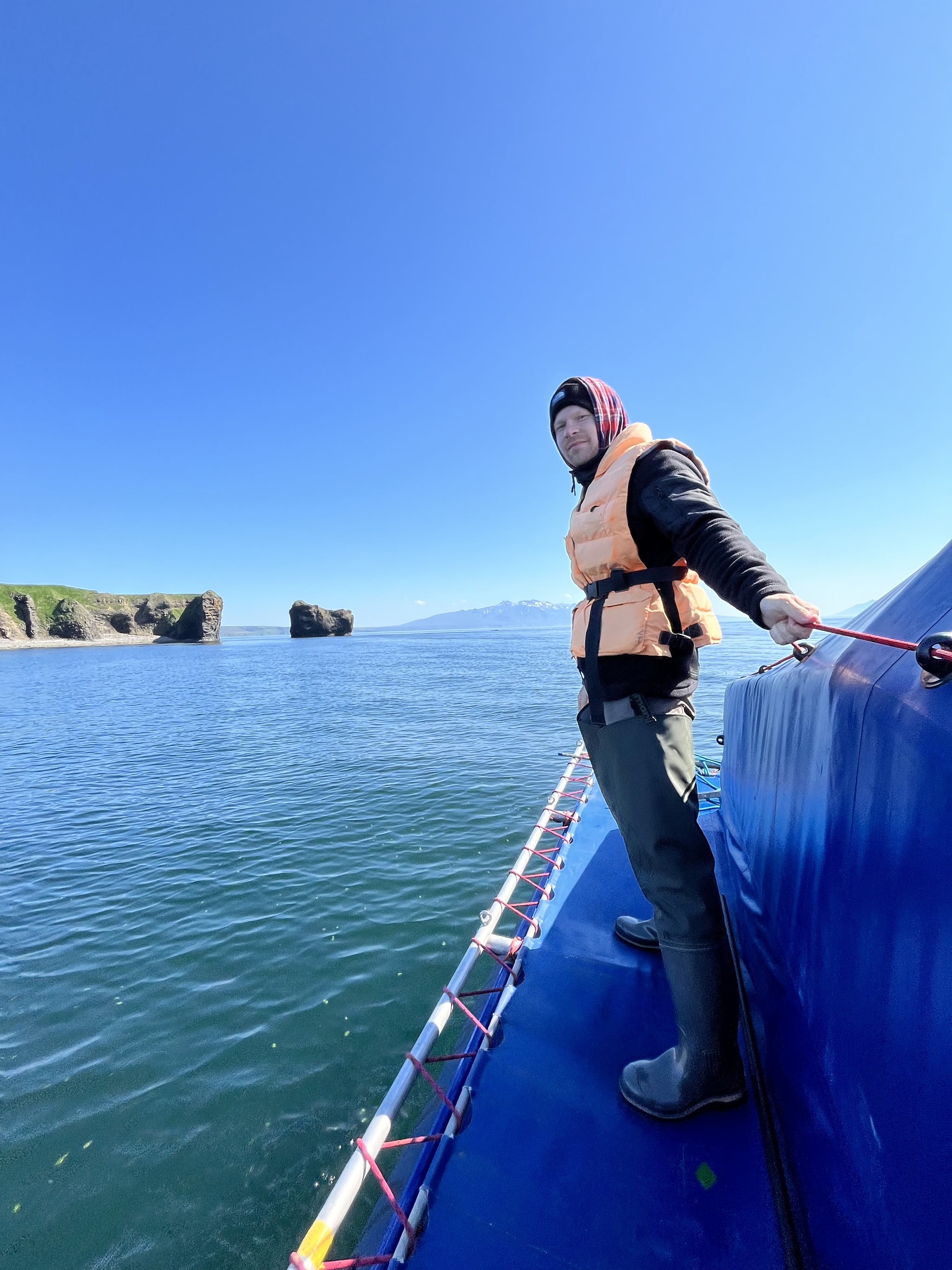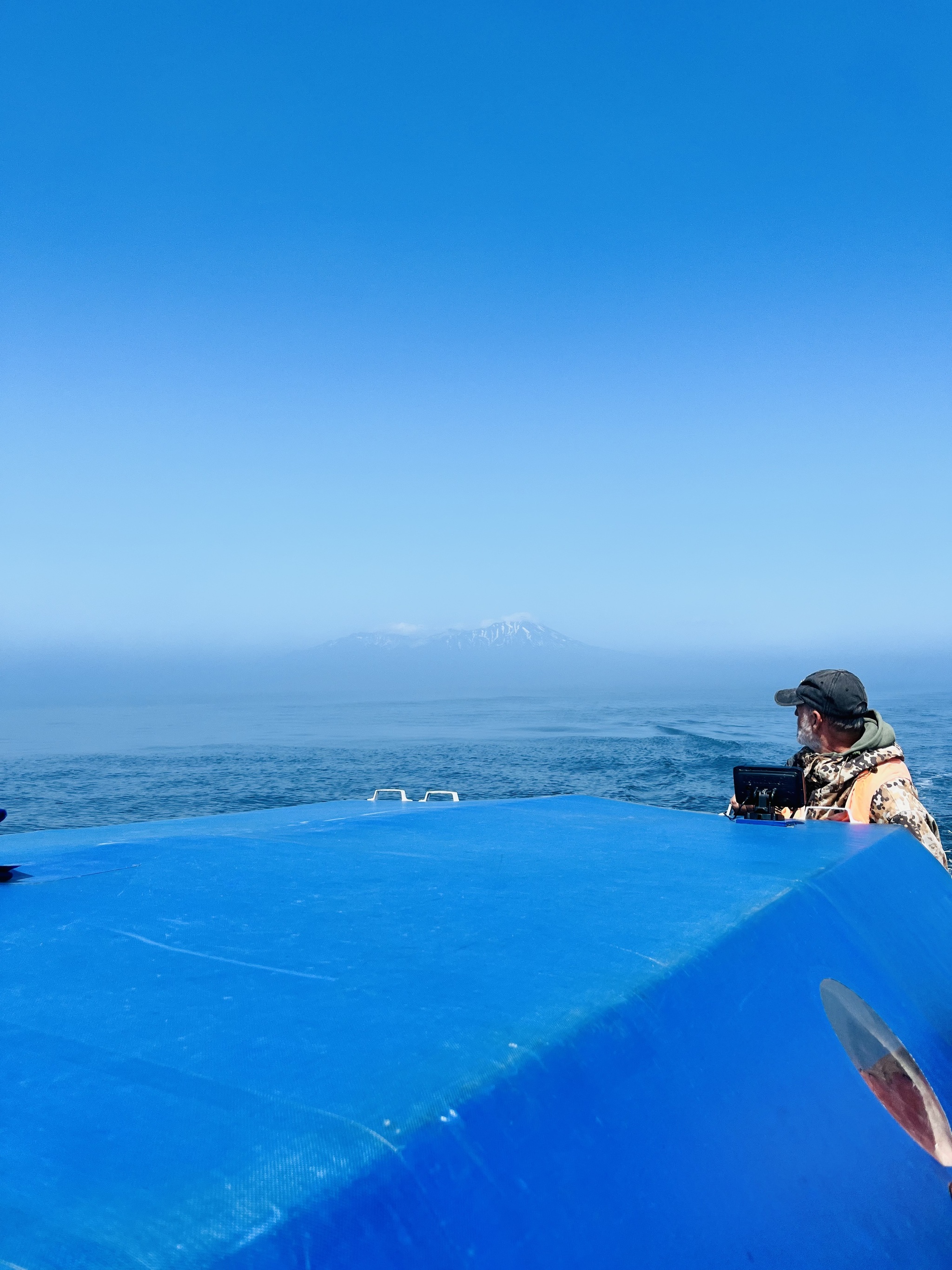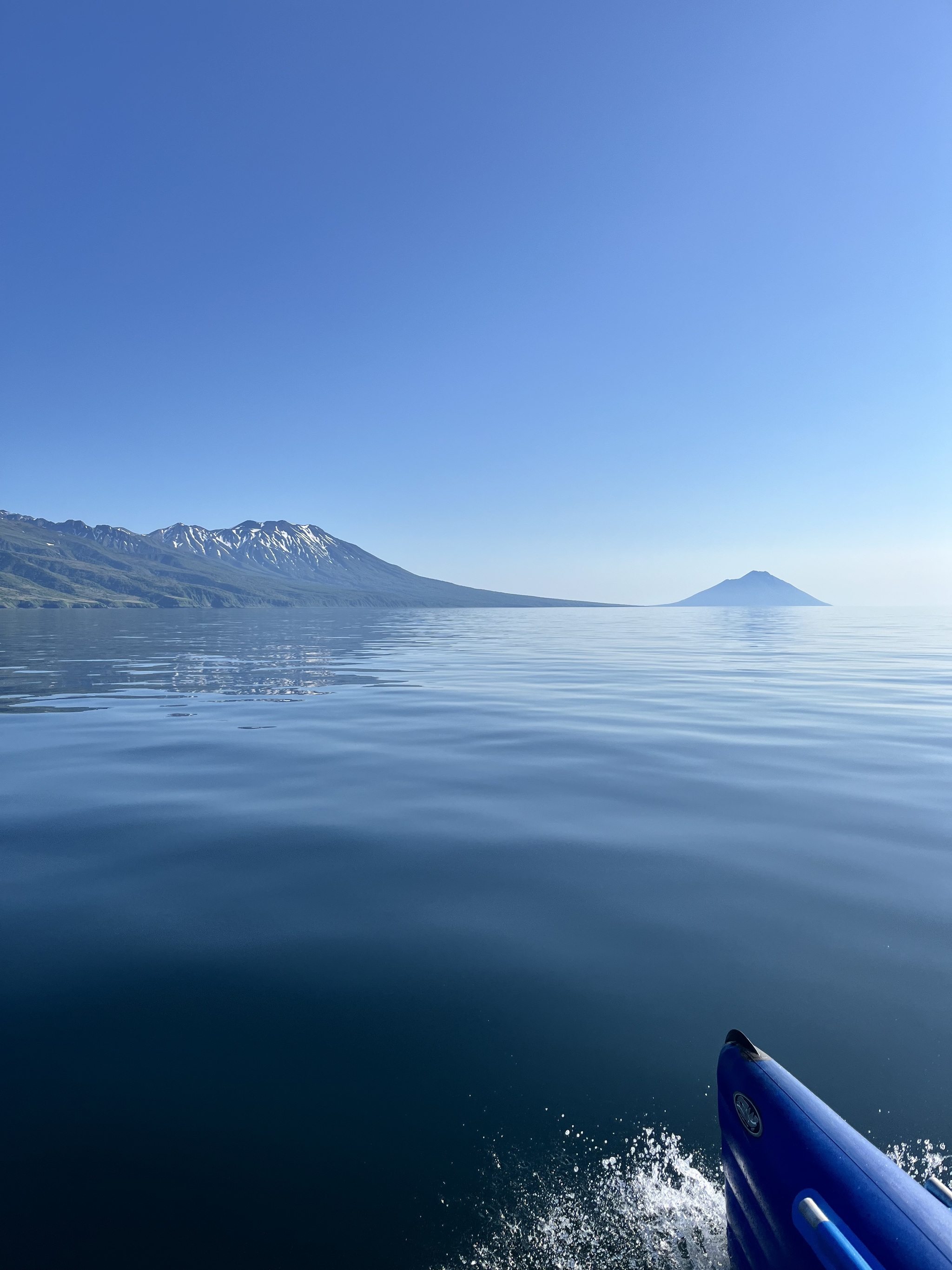 Разрезая морское зеркало тримараном, мы постепенно приближались к нашей бухте, до нее оставалось примерно 2 часа пути, кажется вот она рукой подать, а мы все плыли и плыли, как будто-оставаясь на месте. Хорошо видно хребет богатырь и вулкан Стокап (1634м, самый высокий вулкан Итурупа), чуть дальше русская фудзияма- Атсонупури и его конус над гладью воды.